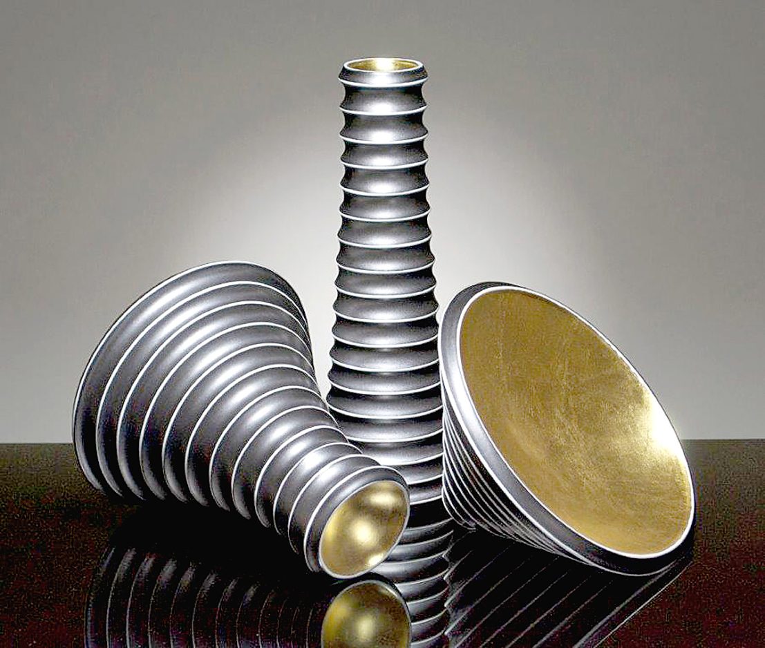 Justin Teilhet, a ceramicist from Yellow Springs, Ohio, showed an arresting collection of porcelain objets d’art. Concentric circles formed vessels that were glazed in gunmetal and given 24-karat-gold-leaf interiors. The pieces were simple and dynamic. (www.jteilhetporcelain.com )