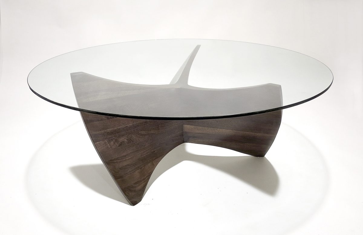 A sleek circle of glass was perched on a sinuous wood base that looked like a weathered, waxed whale vertebra, and the juxtaposition made for a piece that was as much sculpture as furniture. (www.aaronscottdesign.com )