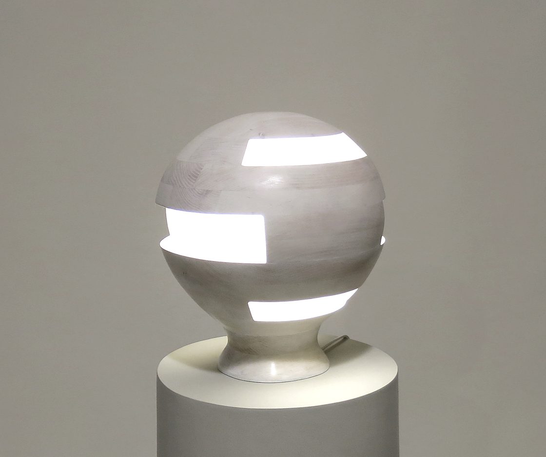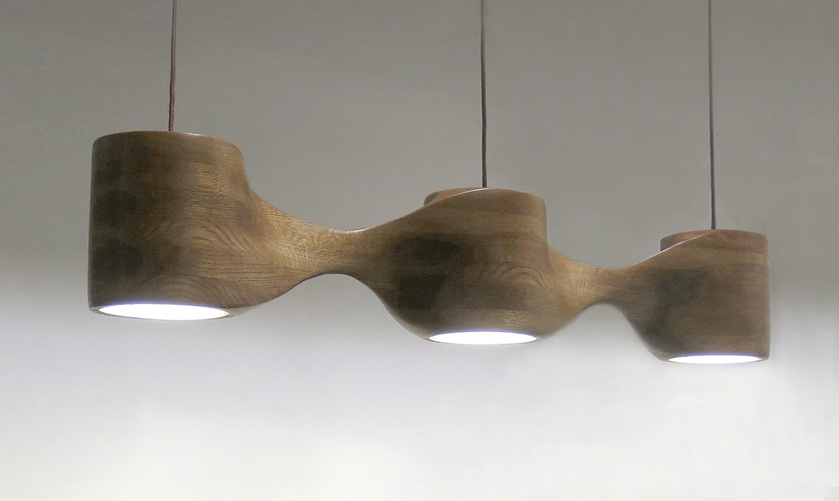 His curvy, oiled-oak pendant lamp somehow managed to evoke a tree burl and a ship’s propeller; at once organic and mechanical. The same was true of a round table lamp crafted of layers of bleached wood circles, with cutouts to reveal the light beneath.