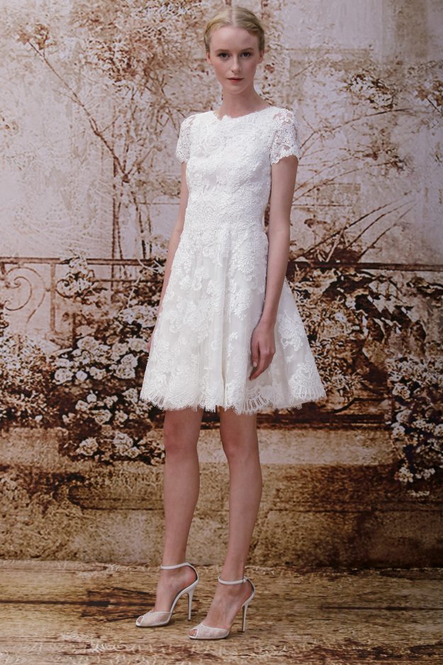 Exactly how short is up to the bride. There are minis, high-low hemlines (high in the front and lower in the back), knee lengths, tea lengths below the knee and so-called “transformers,” where a long train or sheer skirt detaches to show off a short dress underneath.
