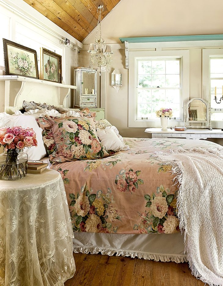 Roses are everywhere in the classic vintage bedroom, on bed linens, in prints and vases. A distressed paint finish adorns the cabinet and mirror, blending quietly into the antique white walls. The aquamarine window top is a happy surprise, a taste of retro.