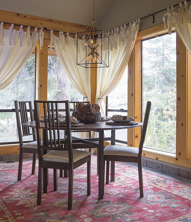 It’s always fun to have a story to tell, and the design concept behind the Glendale pendant from Hudson Valley (www.hudsonvalleylighting.com) that hangs above the dining table in a cozy ski chalet is a good one. Remember Sputnik, the famous satellite that was launched in 1957? Hudson Valley tells us that the Glendale pendant revives the innovative spirit of Sputnik by suspending the signature starburst within a crisp, textured cube to create a play of stunning effects. The series is available in three sizes and in either aged-brass or polished-nickel finishes. The soft, white sheers that frame the large expanse of windows help to further project a feeling of floating quietly in the air, as does the clean design of the table and chairs. This is a relaxed, imaginative space that fits seamlessly into a country setting.