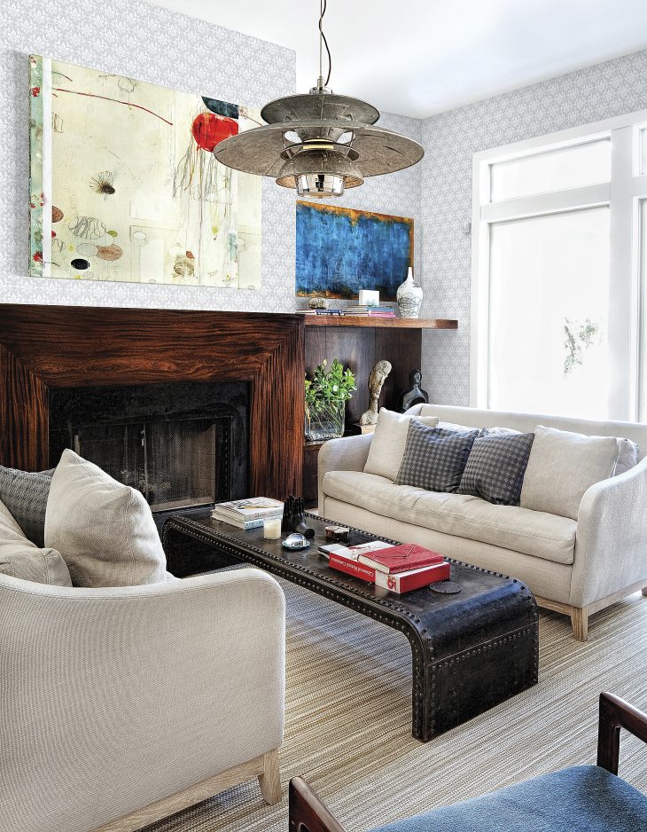 A very different pendant from Troy Lighting’s (www.troy-lighting.com) new Aviation Collection, Idlewild, is classic industrial modern. Iron and vintage aluminum panels are welded together to form a tiered pendant with exposed rivets and finished in aviation gray. The LED light delivers powerful illumination down a fluted glass diffuser, and is dimmable for maximum versatility. There are a variety of pendant sizes, as well as a one-tiered wall sconce in the Aviation Collection. Hanging lights are not often positioned in a living room; we think of them best placed over tables or islands. But this eye-catching pendant is suspended over an inviting sitting area, which combines strong wood elements on the fireplace surround with traditional white sofas and contemporary art. It makes a stunning setting, where contrasts in color and materials combine freely to produce a harmonious whole.