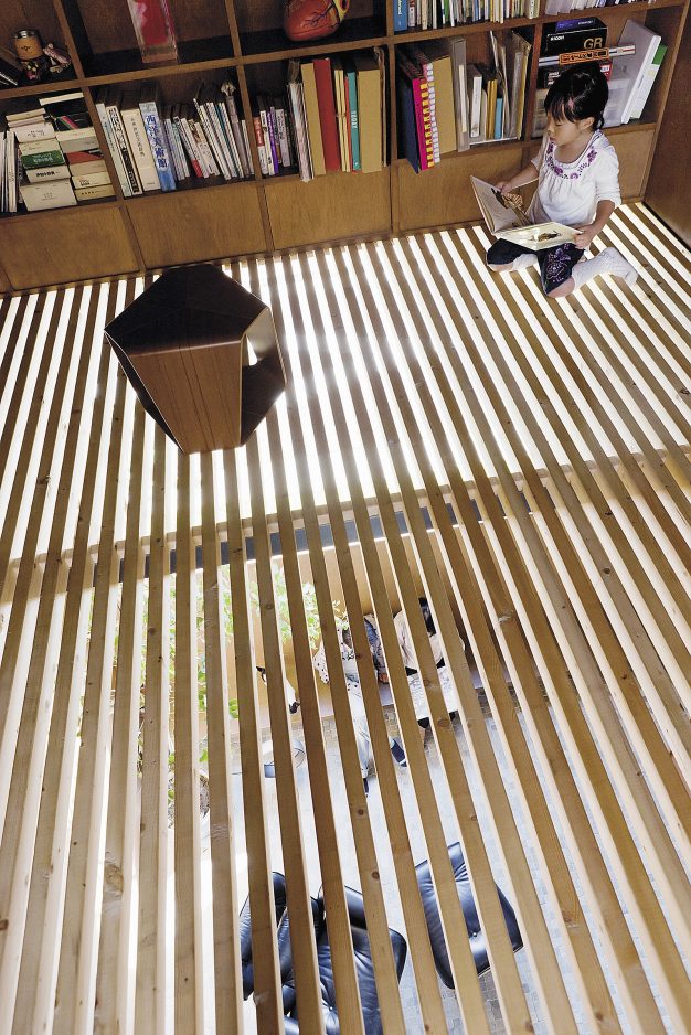 The architect Go Hasegawa designed one Tokyo house with a louvered floor, consisting of wood flooring with generous slivers of open space between the floorboards, giving the illusion of space and allowing sunlight from a big upper window to reach the ground floor.