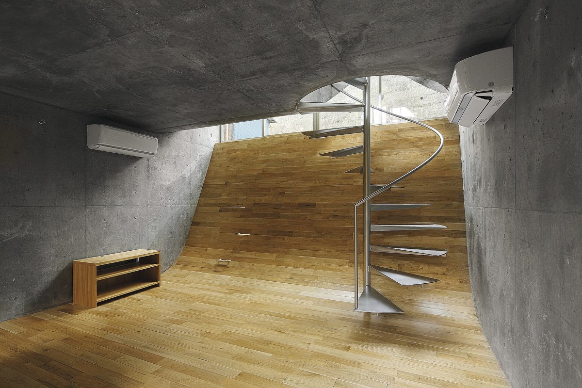 In a Yokohama house designed by Takeshi Hosaka Architects, the basement level of a 980-square-foot house features a hardwood floor that slopes sharply upward at one end toward the street-level window above, resembling a sleek sort of skateboard ramp. There is no defining line between floor and wall. The ceiling, in turn, slopes steeply upward, allowing for an enormous, almost story-high window.