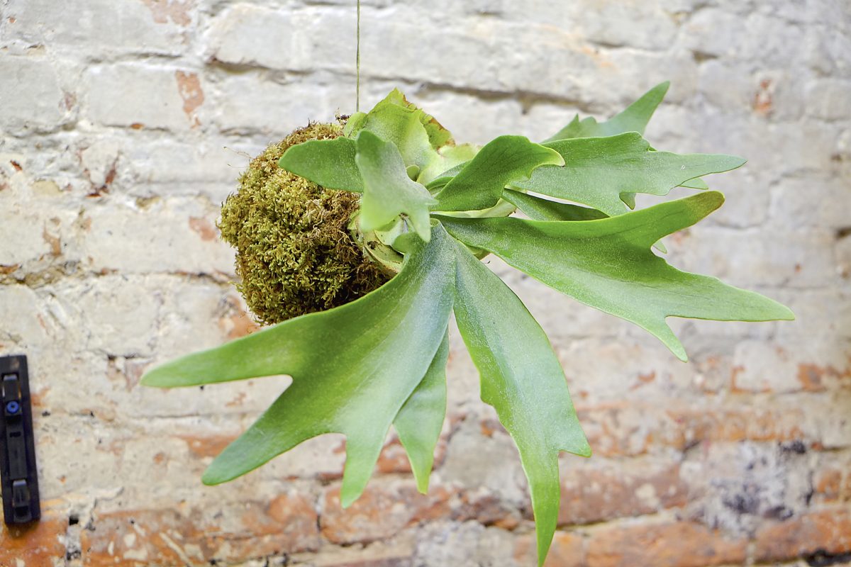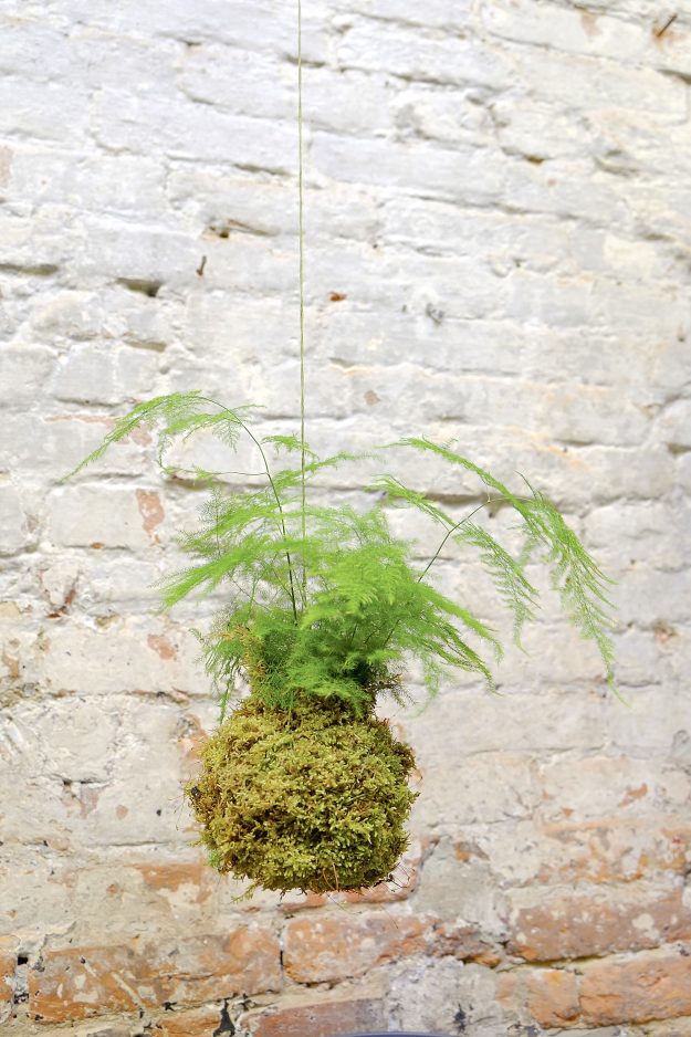 Kokedama should be hung in a way that’s easy to take it down for watering, because you’ll need to soak the whole ball. Hill soaks them for 15 minutes or so and then lets them sit till they’re not dripping.