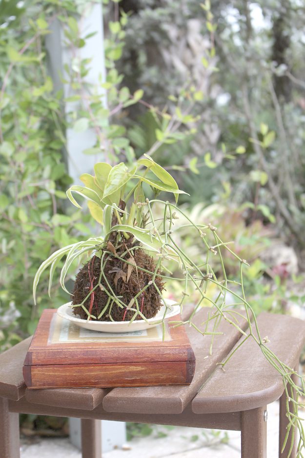 Outdoors, kokedama shouldn’t be in direct sun where they will dry out, and if you live in a cold climate they’ll need to come indoors for the winter. So choose plants with those factors in mind.