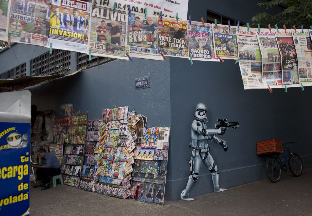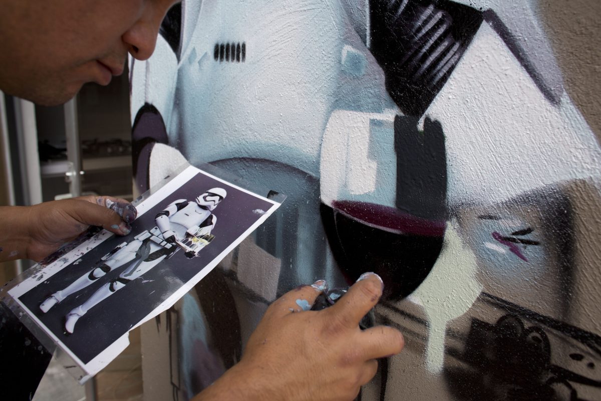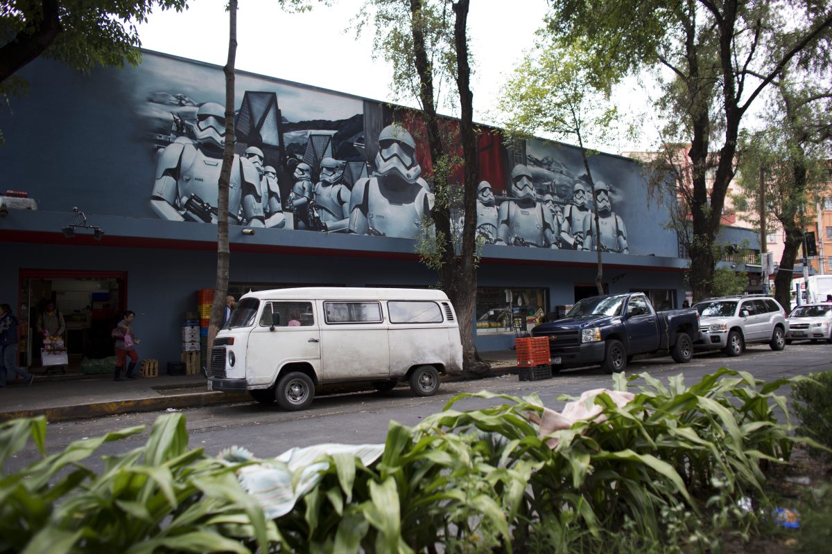 In recent weeks, Street Art Chilango artist Andrik Figueroa Barreto, who signs his work as Andrik Noble, has produced several Star Wars-themed murals, including a 60-foot-long storm trooper mural at the Mercado Michoacan. “I don’t have any studio. Everything is in the street,” said the artist, whose hands, T-shirt, and shorts were covered in paint smudges of a dozen different colors.