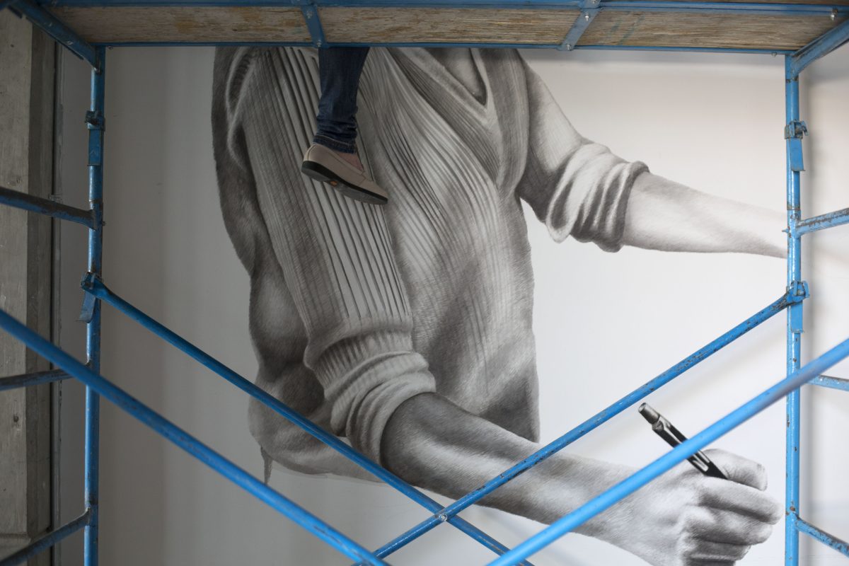 Two miles away, fellow Chilango artist Beatriz Avila Haro sat on scaffolding 10 feet in the air as she applied strokes of black to a white wall.
