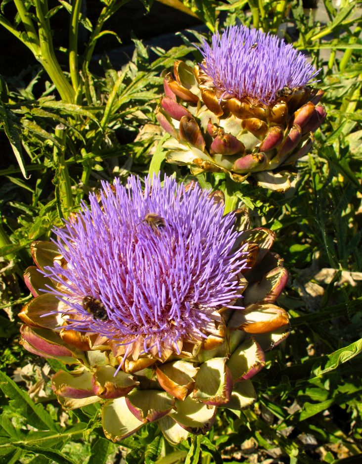 Globe artichokes have much to contribute to home gardens, from providing thin layers of leathery leaves for delectable dining to serving as flowery backdrops in border settings. Pollinators like their purple, thistle-like blooms, too.