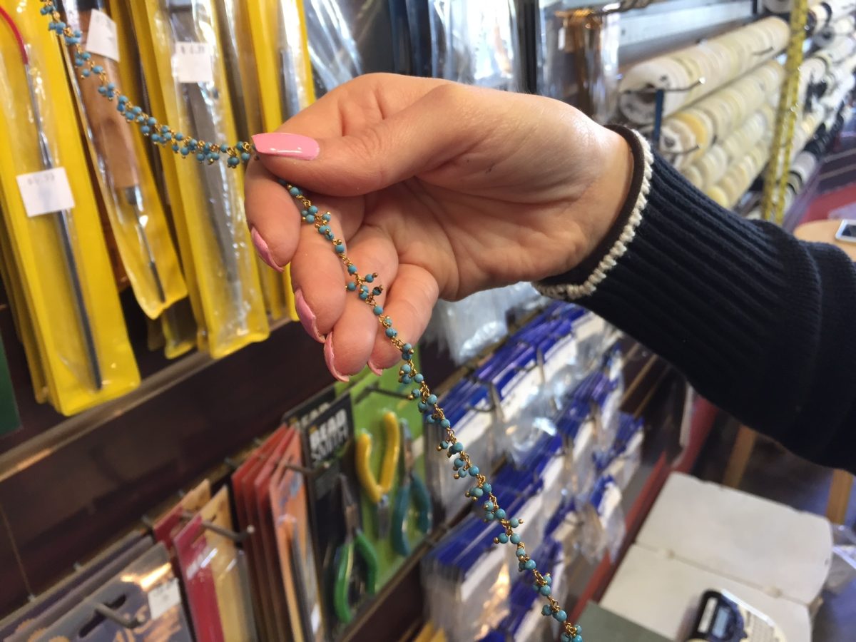 Inside the company’s store in the L.A. hipster neighborhood of Silver Lake, Atamian stood surrounded by spools of chain, silk cord and strands of glass and stone beads, ranging from roughly $6 to $52 per strand, in a rainbow of colors. Dozens of containers brimmed with individual wooden, metalized plastic and metal beads in various shapes – stars, hearts, circles – priced as low as 5 cents per bead. Atamian noted that making a spiffy necklace can cost as little as $5, and take five minutes.