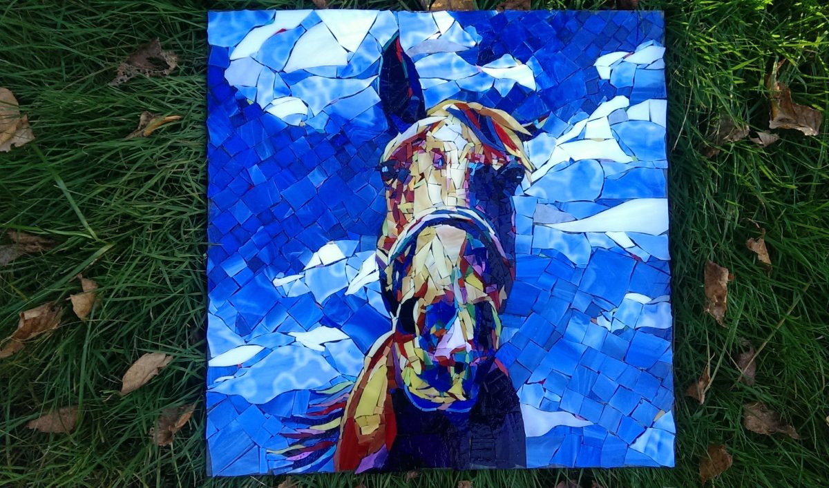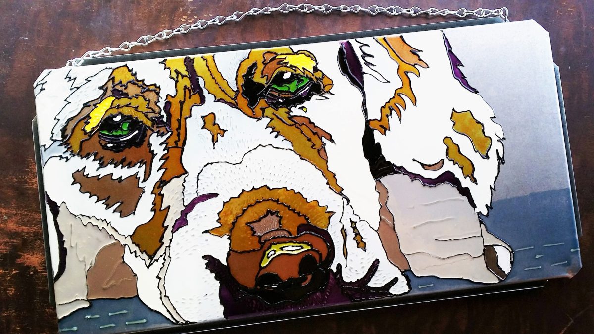 Glass pieces lend vibrancy to Suzanne Coverett Earls’ pet portraits. “Glass enables me to bring the realistic sparkle and depth to the eyes of my furry subjects,” she says from her rural home near Brantford, Ontario. Earls tries to capture each animal’s quirks and personality in custom-order pieces using hand-cut stained glass. (www.etsy.com/shop/PiecefulArts )