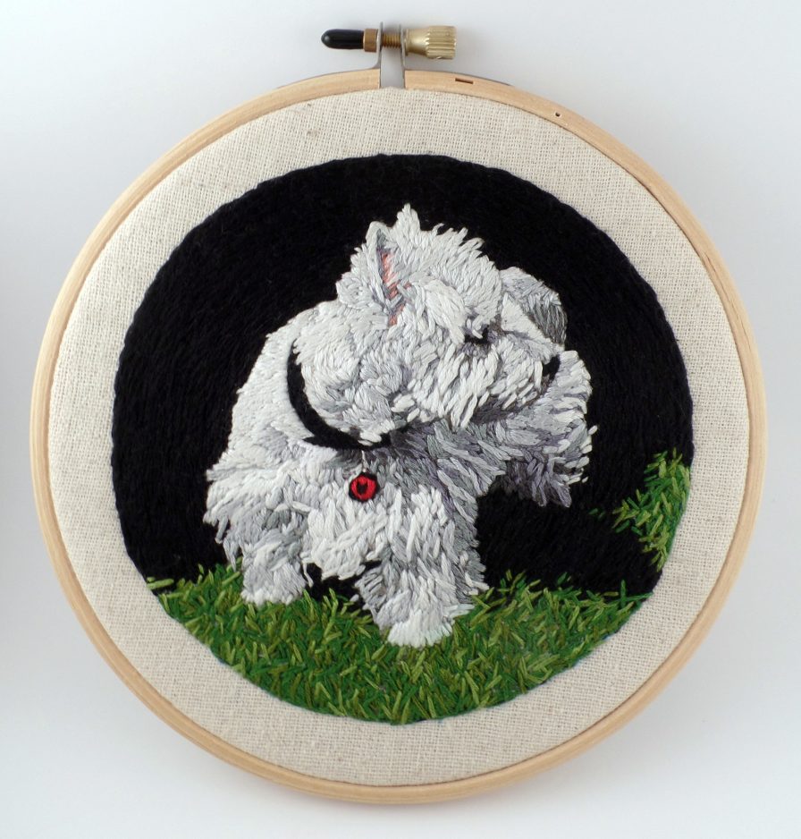 Kathy Halper of Highland Park, Ill., is a painter who recently began embroidering pet portraits framed in embroidery hoops or stretched over square forms. “Embroidery has always been considered a craft, (but) I approach it as an equal, contemporary art form,” Halper says. “The excitement for me is creating the painting experience with thread.” (www.kathyhalper.com )