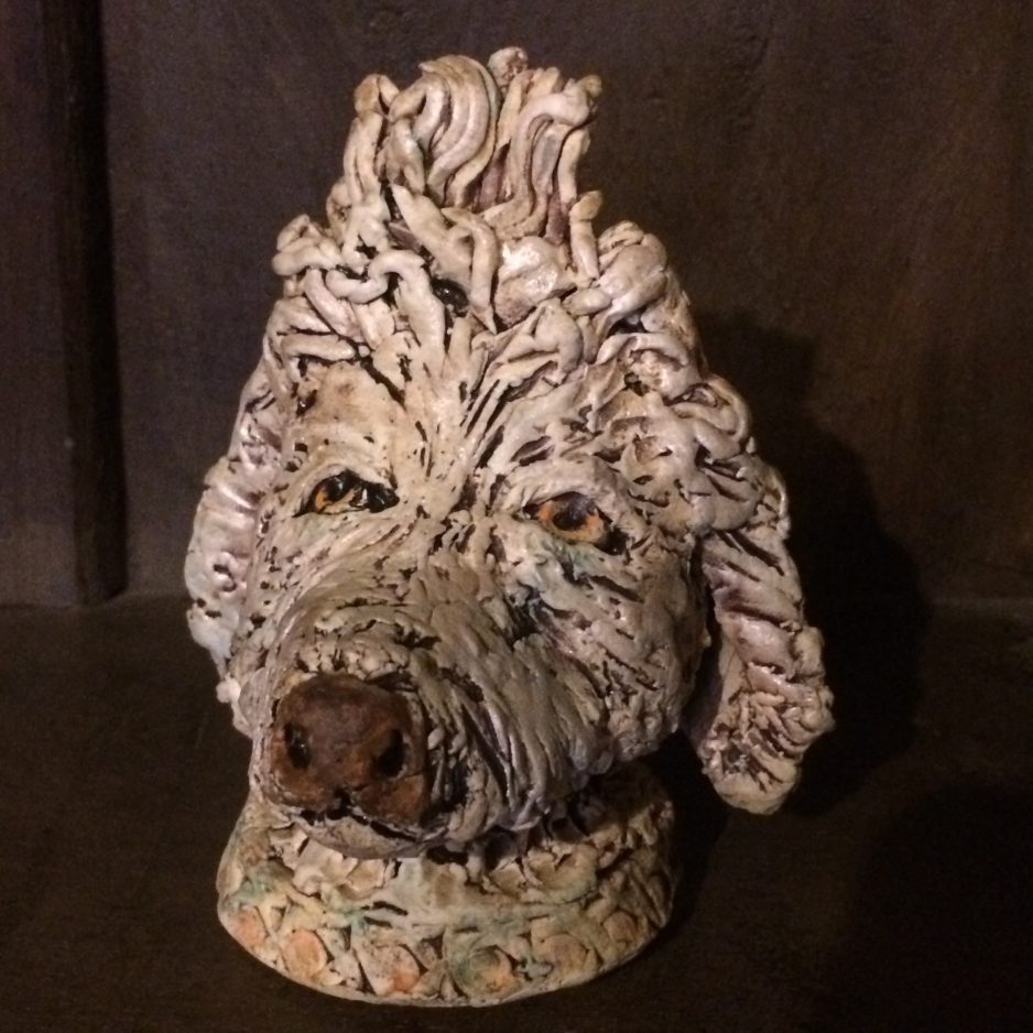 Suzanne Ellenbogen of Golden, Colorado, was creating ceramic jewelry and sculpture when she began sculpting animal heads, starting with her two Goldendoodles, Fred and Ginger. Commissioned work soon followed. “I love that a piece starts as a mound of clay, never knowing exactly what it will be until I start forming it, then adding texture and color,” she says. (www.suzellenbogen.com )