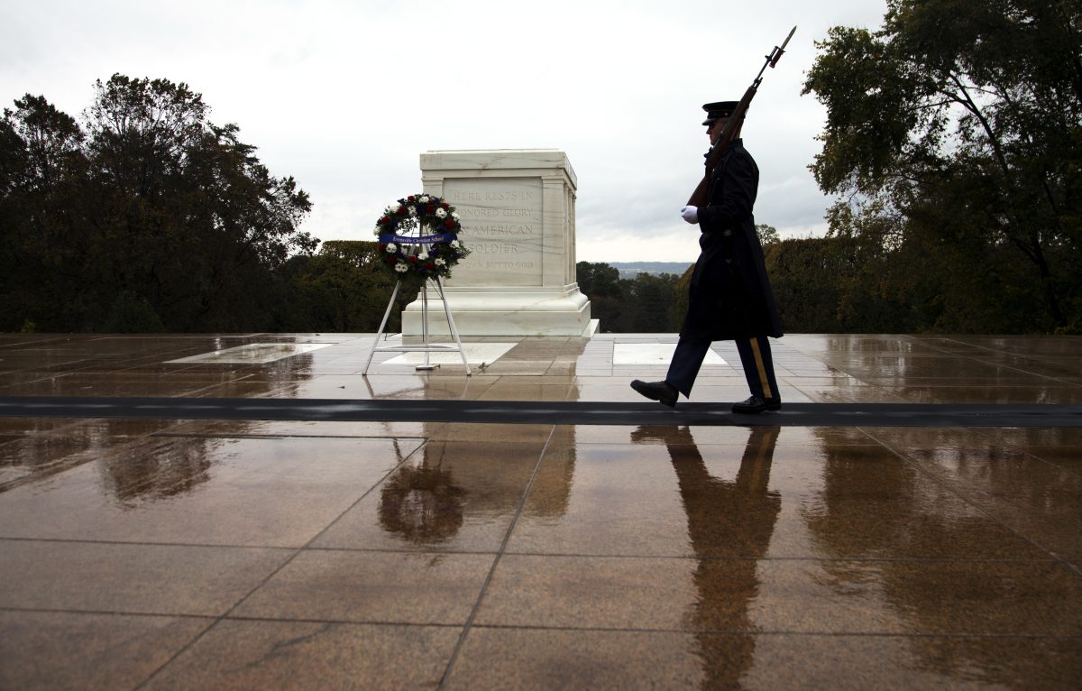 The Tomb of the Unknown Soldier is guarded by a marching uniformed sentinel 24 hours a day, with a changing of the guard on the hour.
