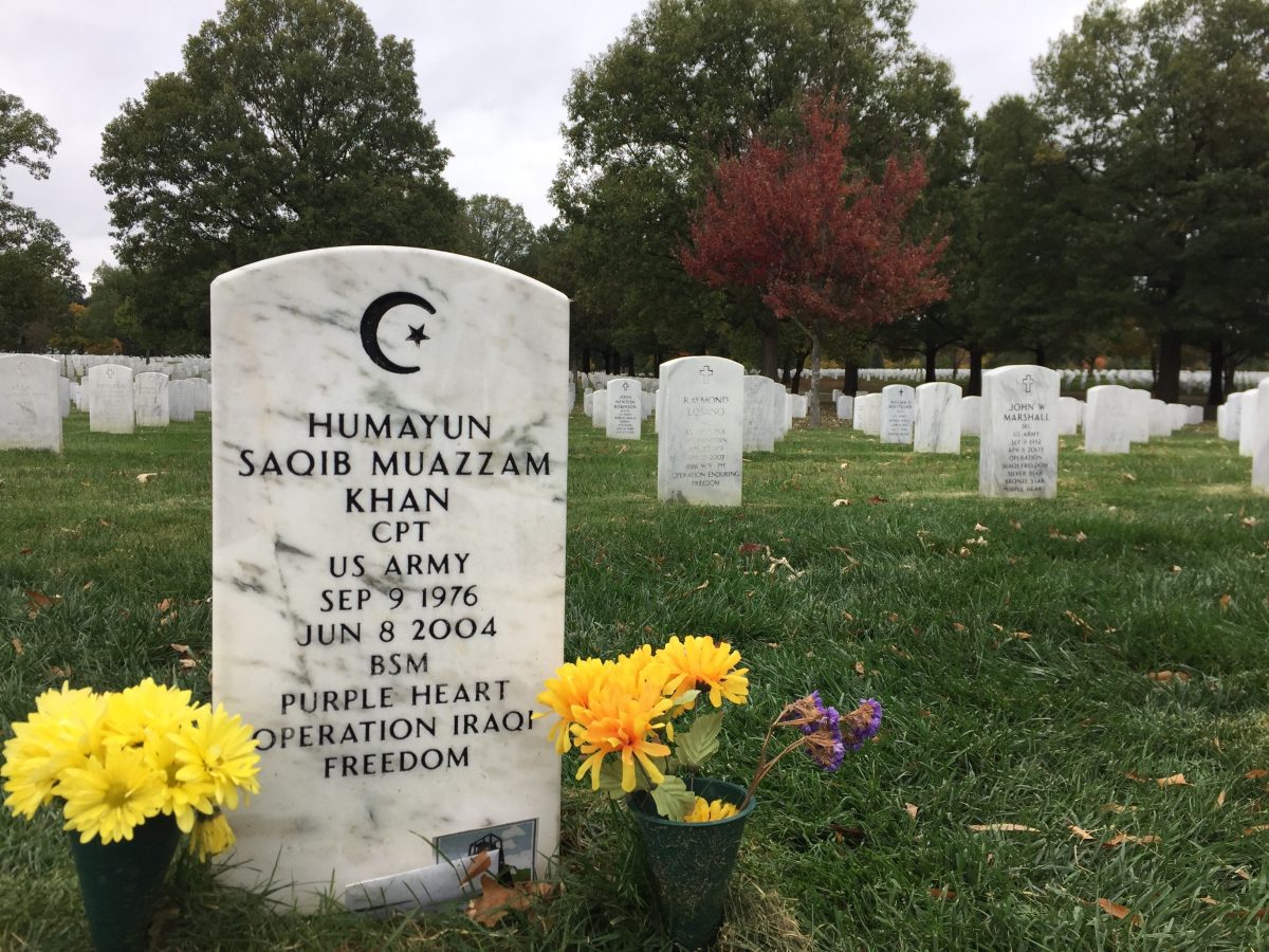 Many famous individuals are buried here, from Hollywood actors to U.S. senators. But one of the most asked-about sites in the last few months has been the grave of Capt. Humayun Khan, whose father spoke at the Democratic National Convention in August. Khan was killed during the Iraq War, and the story of his immigrant Muslim family and their loss became an issue in the presidential campaign. Welcome center staff are accustomed to giving directions to his gravesite, No. 7986 in section 60, where visitors often leave flowers and notes.