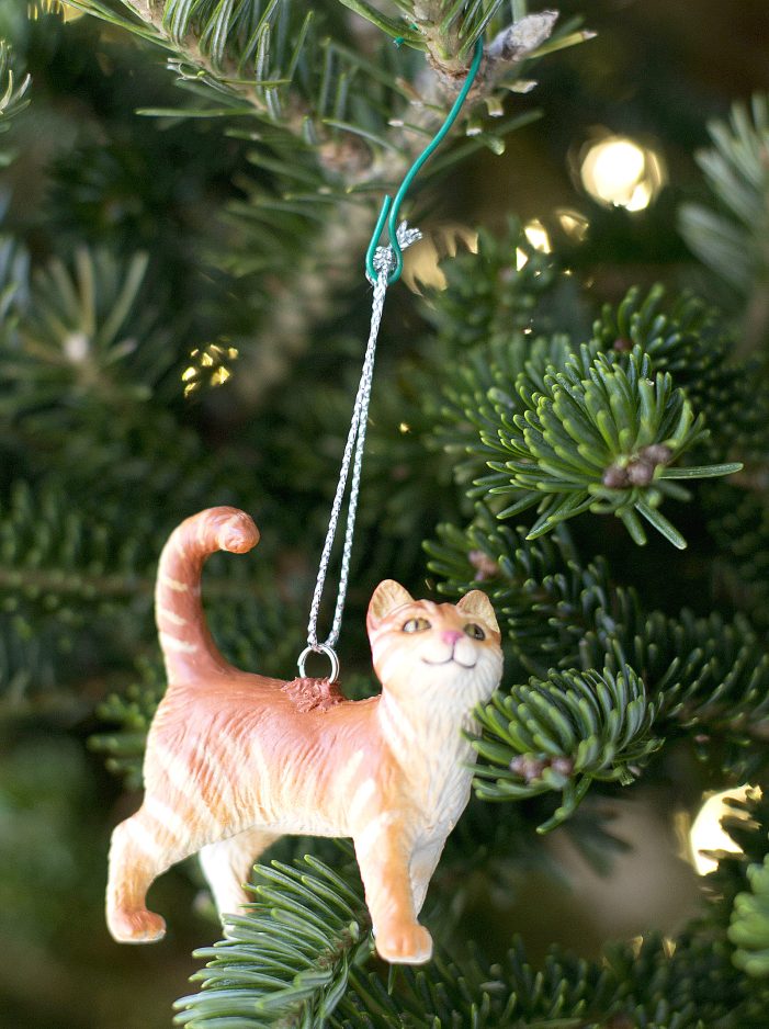 I turned one of my son’s toy cat figurines and several Lego minifigures into ornaments simply by rolling bits of Sugru into balls, sticking them onto the items, and embedding small metal split rings (from the jewelry findings section of the craft store) into the Sugru. The material comes in multiple colors and can be mixed to match other hues.