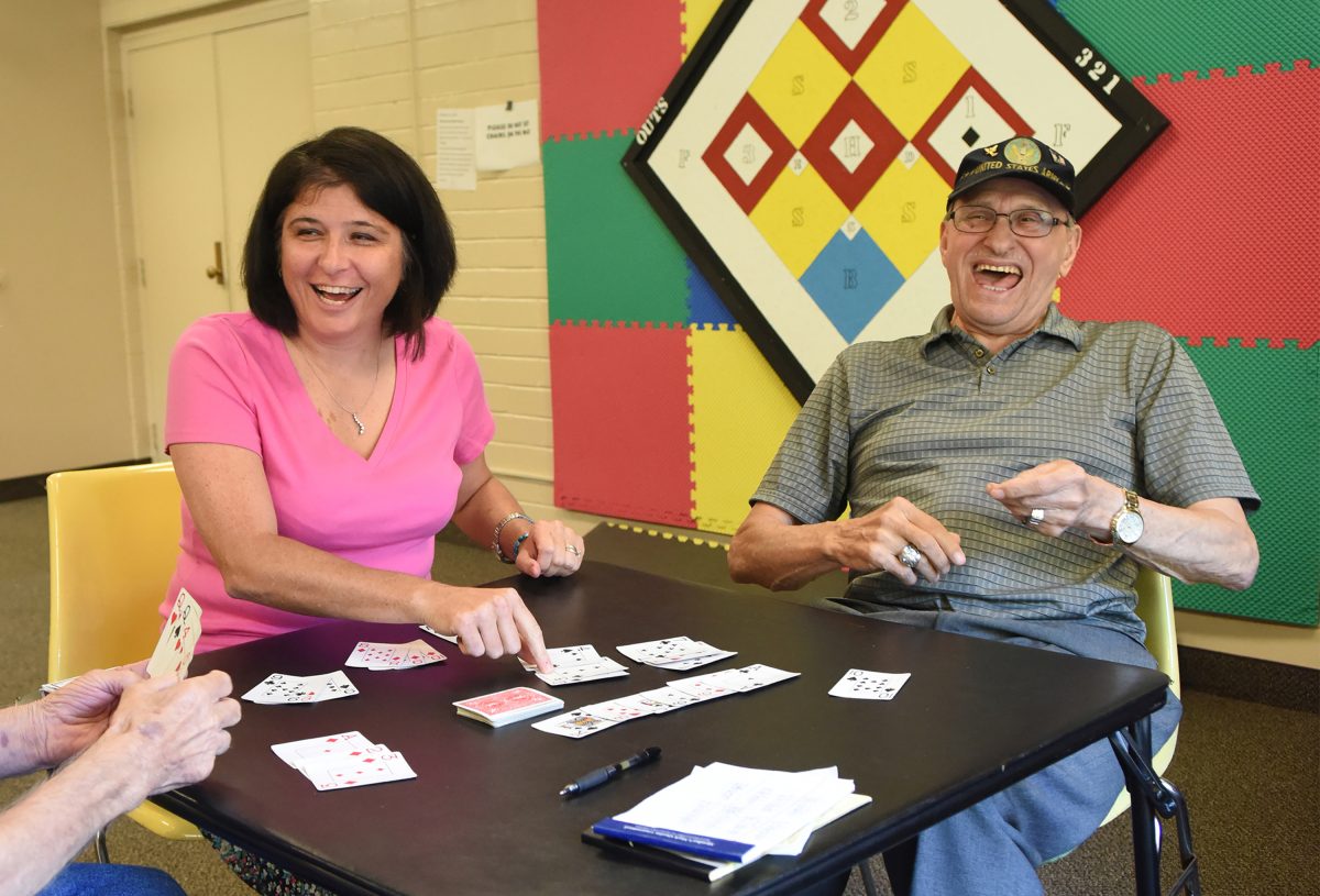 Tracy Sushel plays cards with Joe Thomas at Thomas Campbell Christian Center.