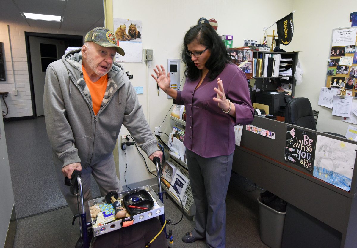 Tracy Sushel talks with Eldon Hull in her office at Thomas Campbell Christian Center.