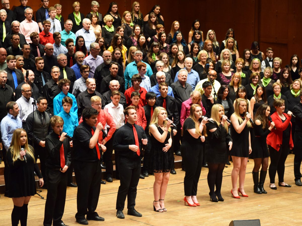 Only three high school groups were featured as performers, joining collegians and professionals from around the world. Members of two other groups directed by Perrotte – the high school’s Rowdy Rhythm choral ensemble and Vocal Confluence, a men’s chorus outside of the school – were part of the Distinguished Concerts Singers International, the multitude of singers who provided backing voices throughout the two-hour show.