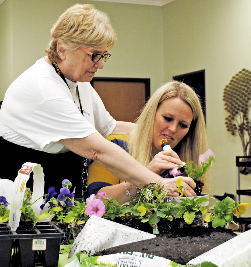 Cookie Taggart, left, a Riverside Horizons client, and Missy Georgagis, senior center specialist, plant flower baskets.