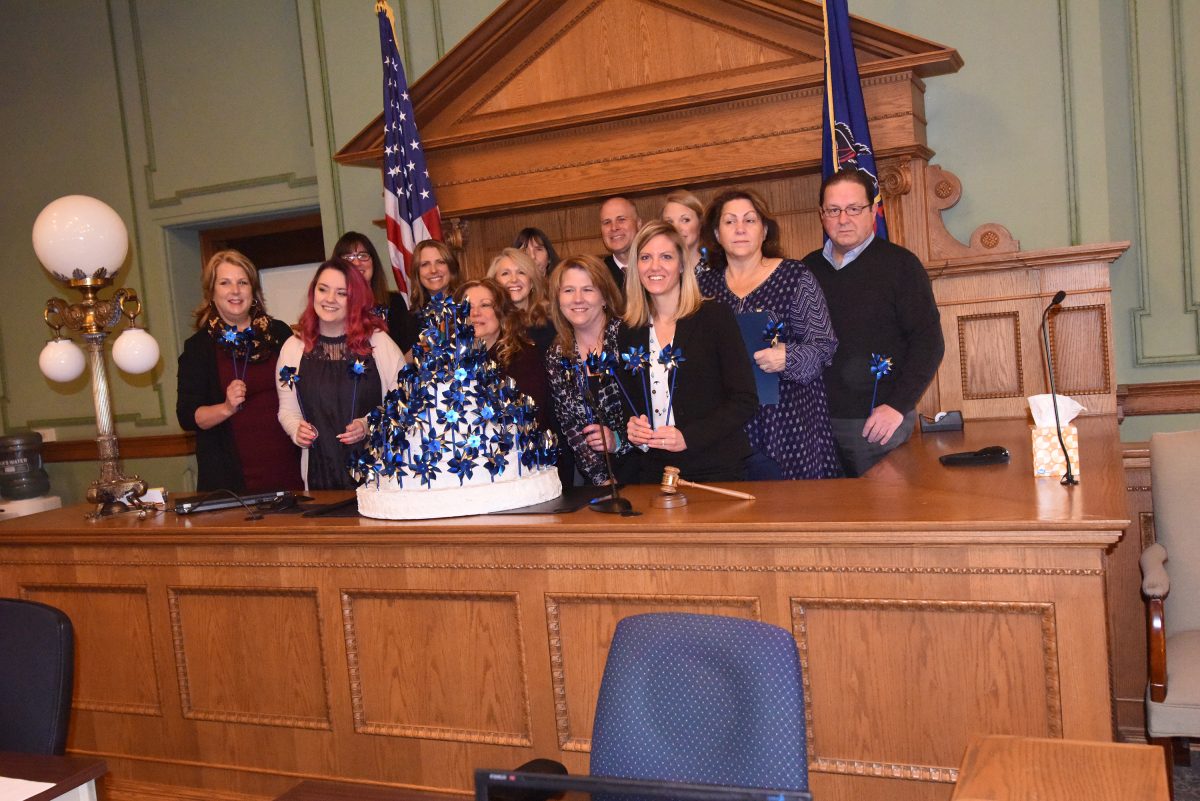 Advocates pose with Washington County Judge Michael Lucas, Washington County’s juvenile dependency judge. Pinwheels on the cake represent the 84 children currently being served by CASA.