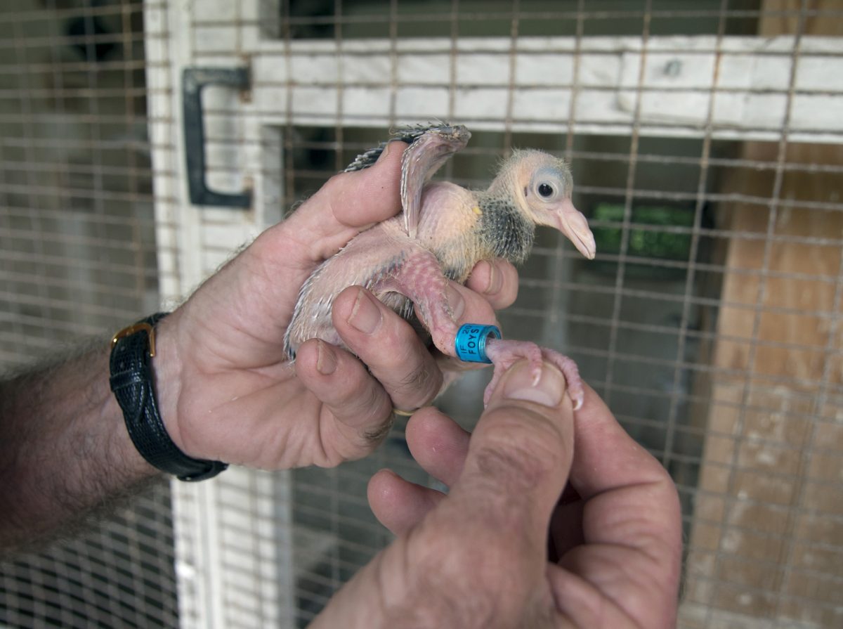 For races, the birds can be driven hundreds of miles away. When Jerry was a kid, pigeons would be sent on trains for 1,500-mile races. They were identified by a number that was attached to a leg with a rubber band. Now the cost is too great to ship the birds by train, so many clubs host smaller races.