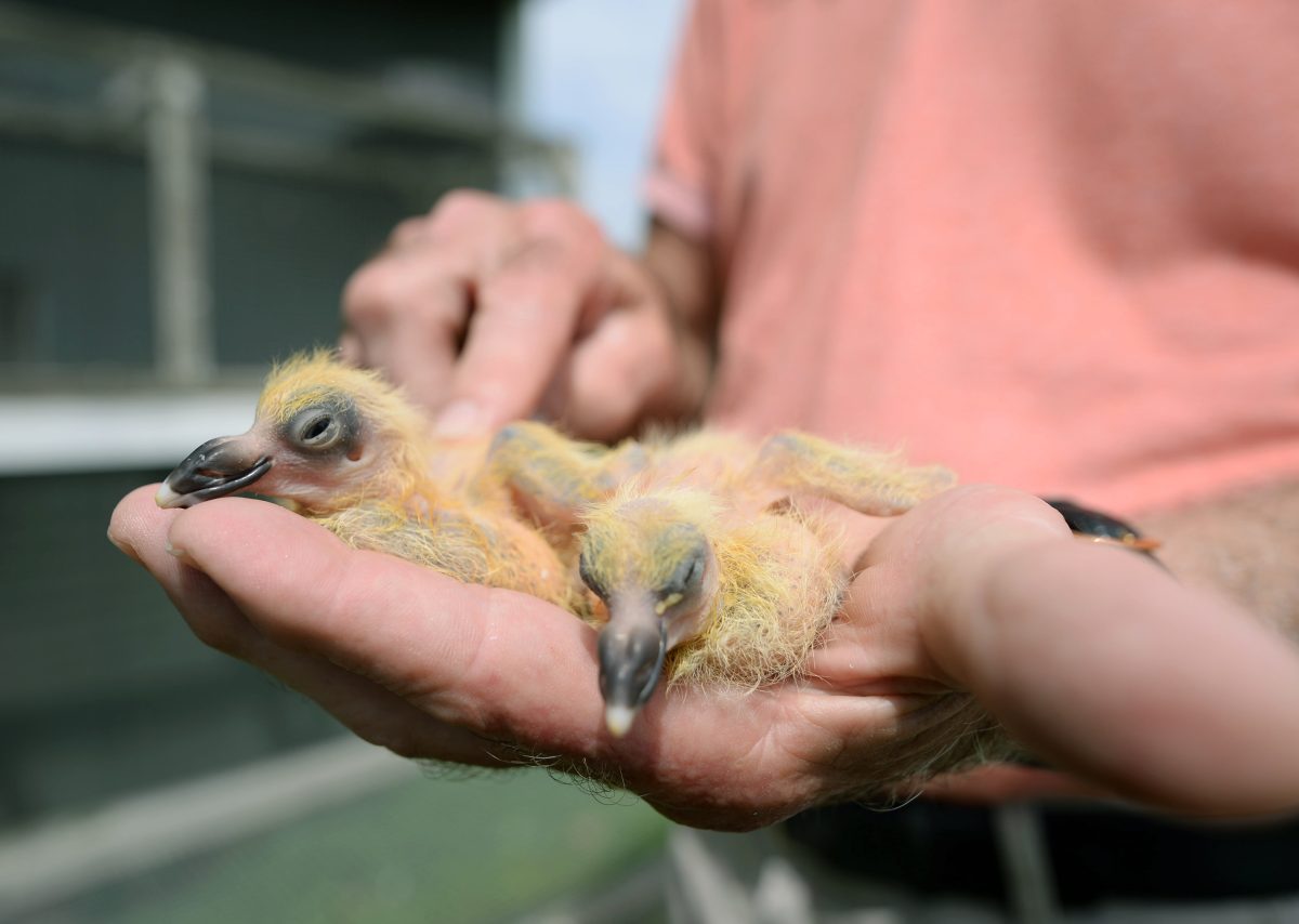 Jerry Gagne holds pigeons that are just a few days old at his Beaver Falls home. Homing pigeons are born with the instinct to find their way home, but the birds have to be trained to return from long distances.