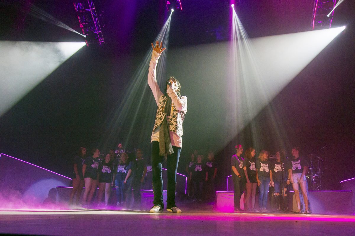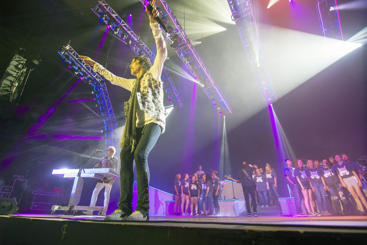 Members of the Burgettstown Area High School chorus sing backup to Foreigner frontman Kelly Hansen during the band’s stop on its Juke Box Heroes Tour.