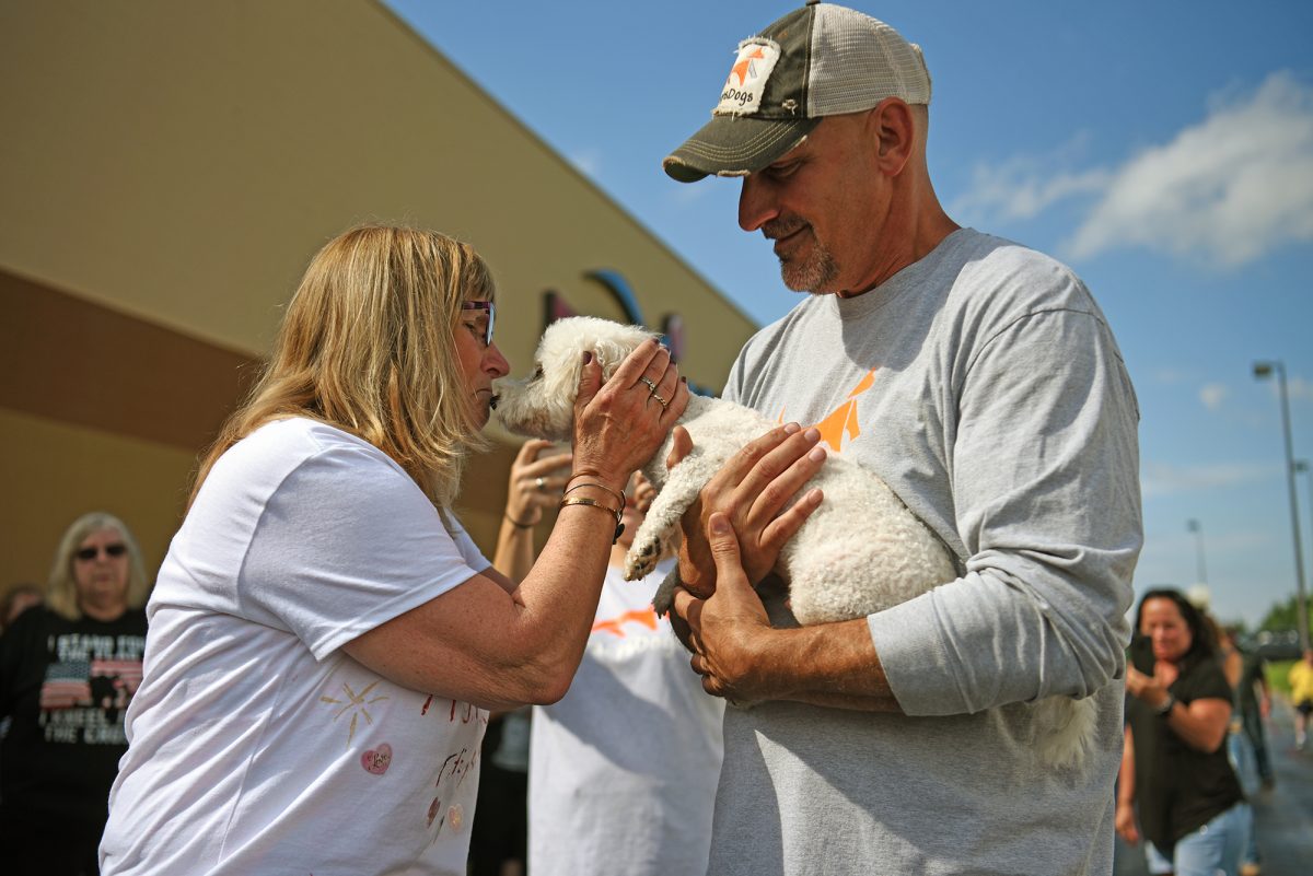Patricia McKenney was first in line, wearing a homemade shirt to greet Pearl, a Bichon poodle the couple planned to adopt. Patricia’s husband, Walter, carried a homemade sign with a similar message. To be there, the couple had driven some 400 miles from their home in the New York City exurb of North Salem.