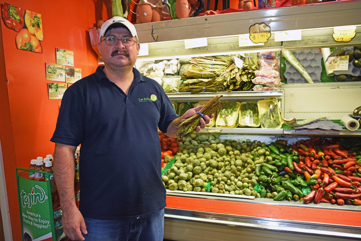 Agustin Berumen, manager of Las Palmas, holds up guajes pods that are sold in the store. The pods grow on trees and the beans inside are taken out of the pods before eating or cooking.