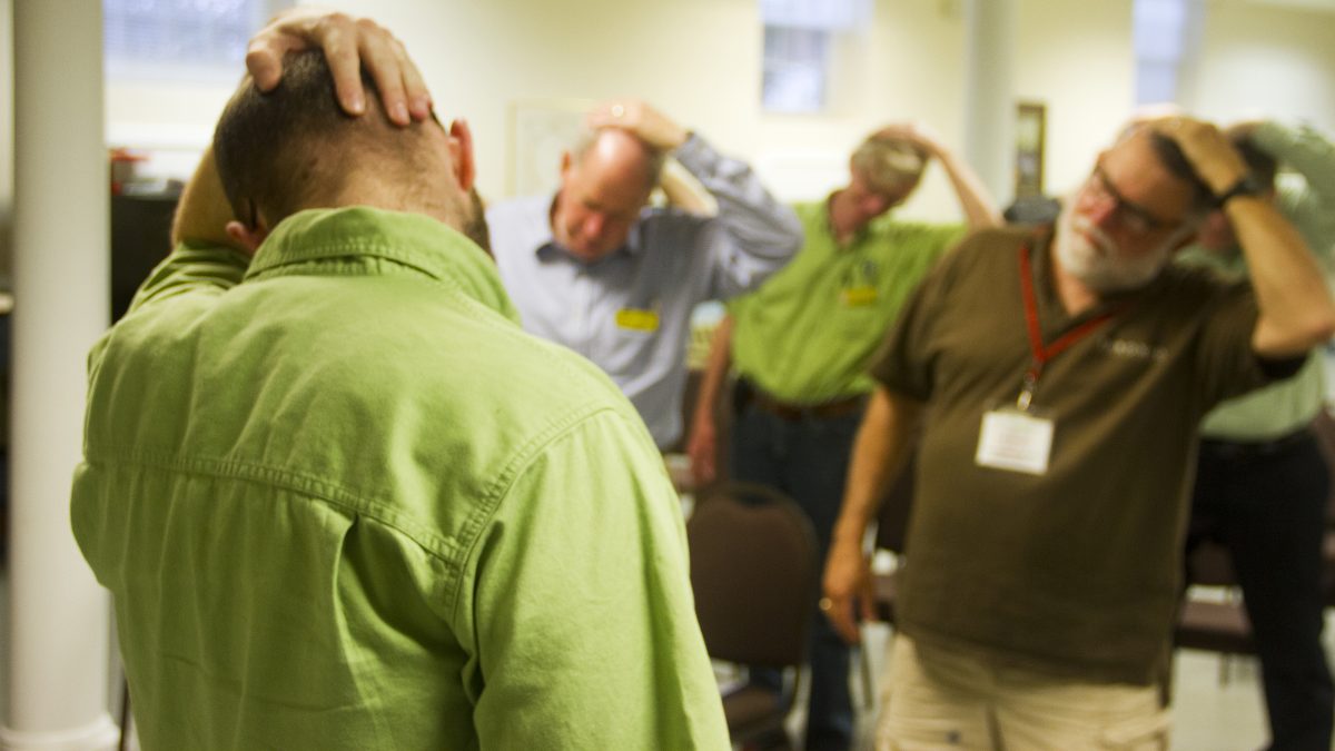 George Fritsch and other group members participate in warmups prior to singing at rehearsal.