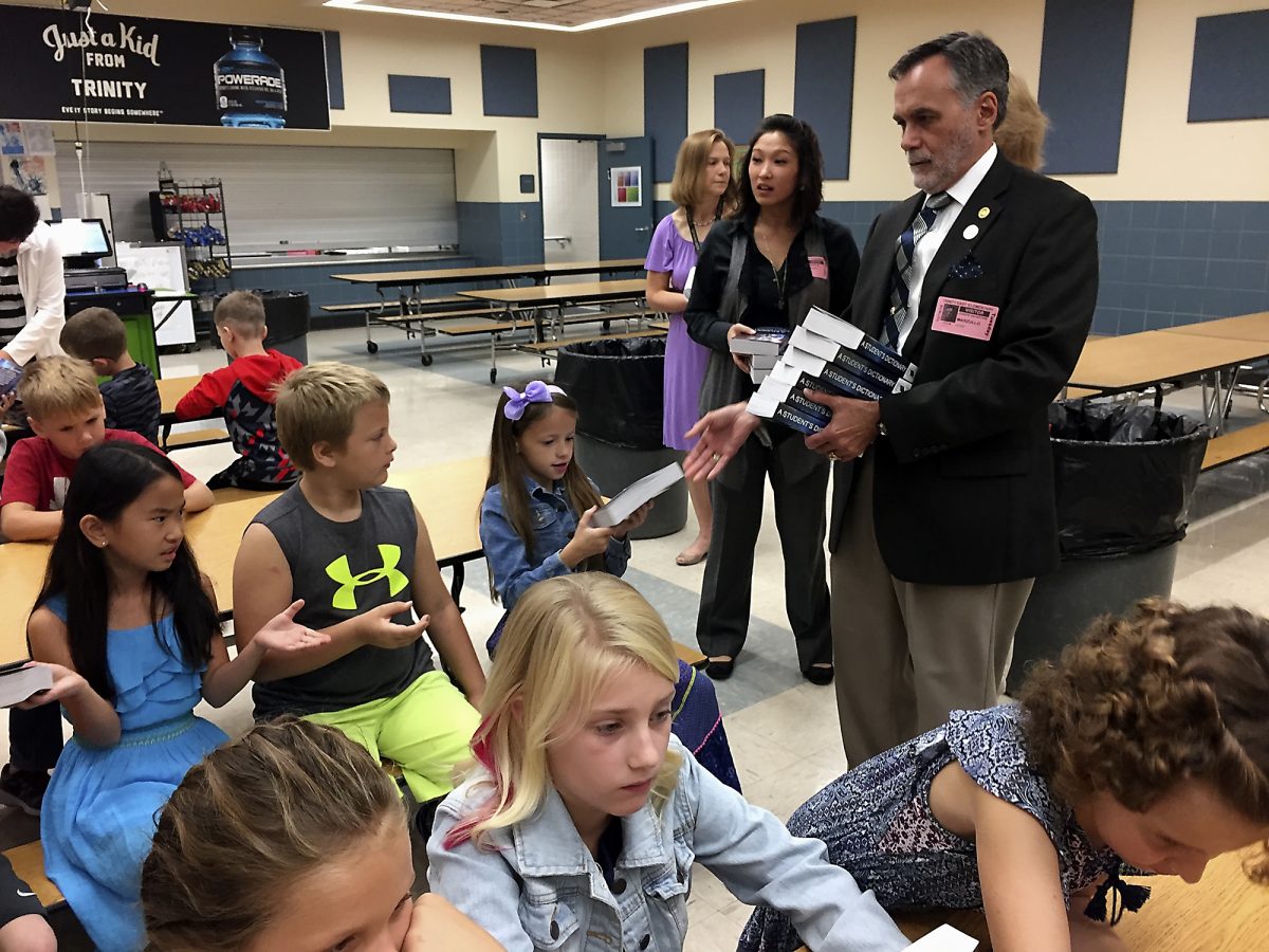 In this 2016 photo, the Rotary Club of Washington visited Trinity East Elementary School to distribute dictionaries to third-graders. The club distributes about 800 dictionaries each year as part of the organization’s global initiative to increase literacy.