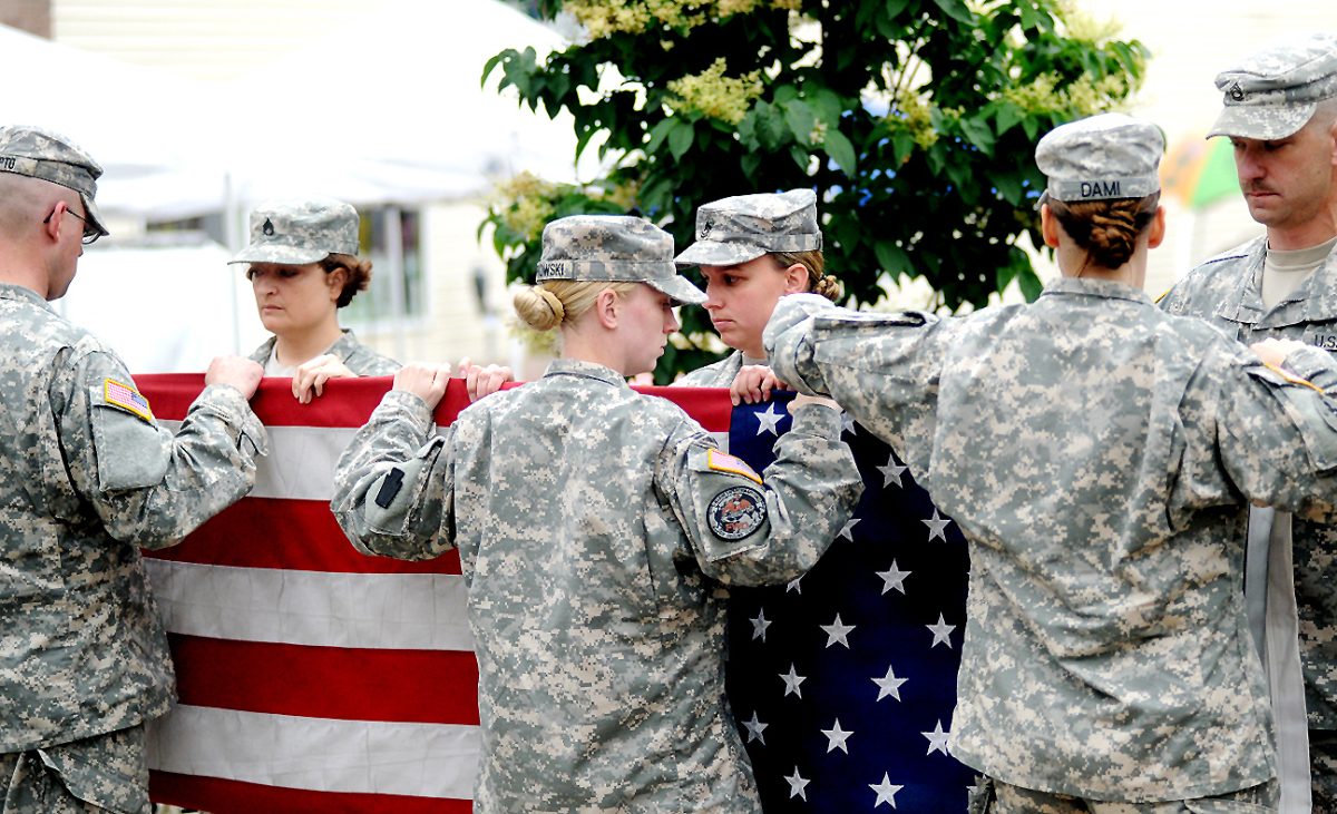 The 2nd Infantry Brigade Combat Team folds the flag during the Changing of the Flag Ceremony on South Main Street in Washington in this 2013 photo. Washington Rotary Club sponsored the event.