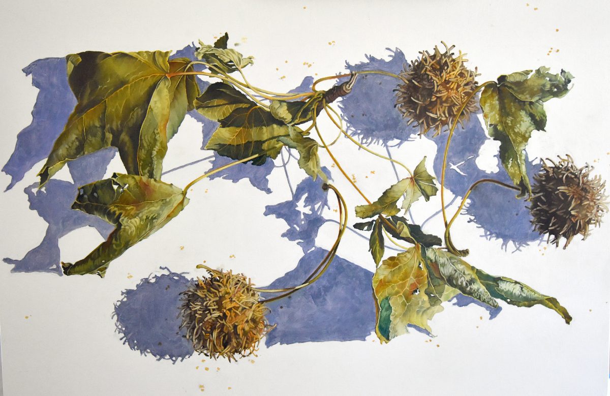 What are you currently working on? I am currently working on a painting of dried leaves and seeds. I am a detail person, and my work reflects it and takes a long time from start to finish. I am also finishing a lino-cut of daylilies.