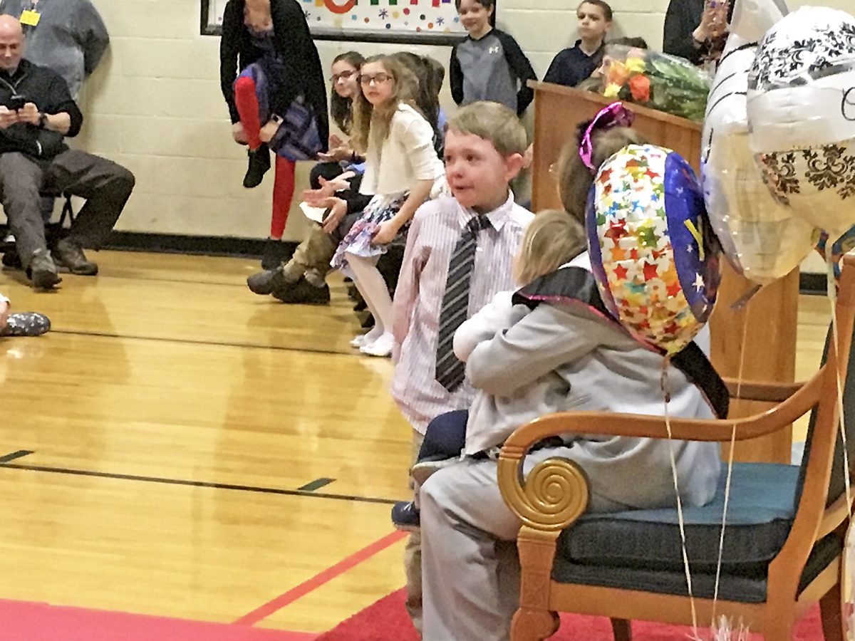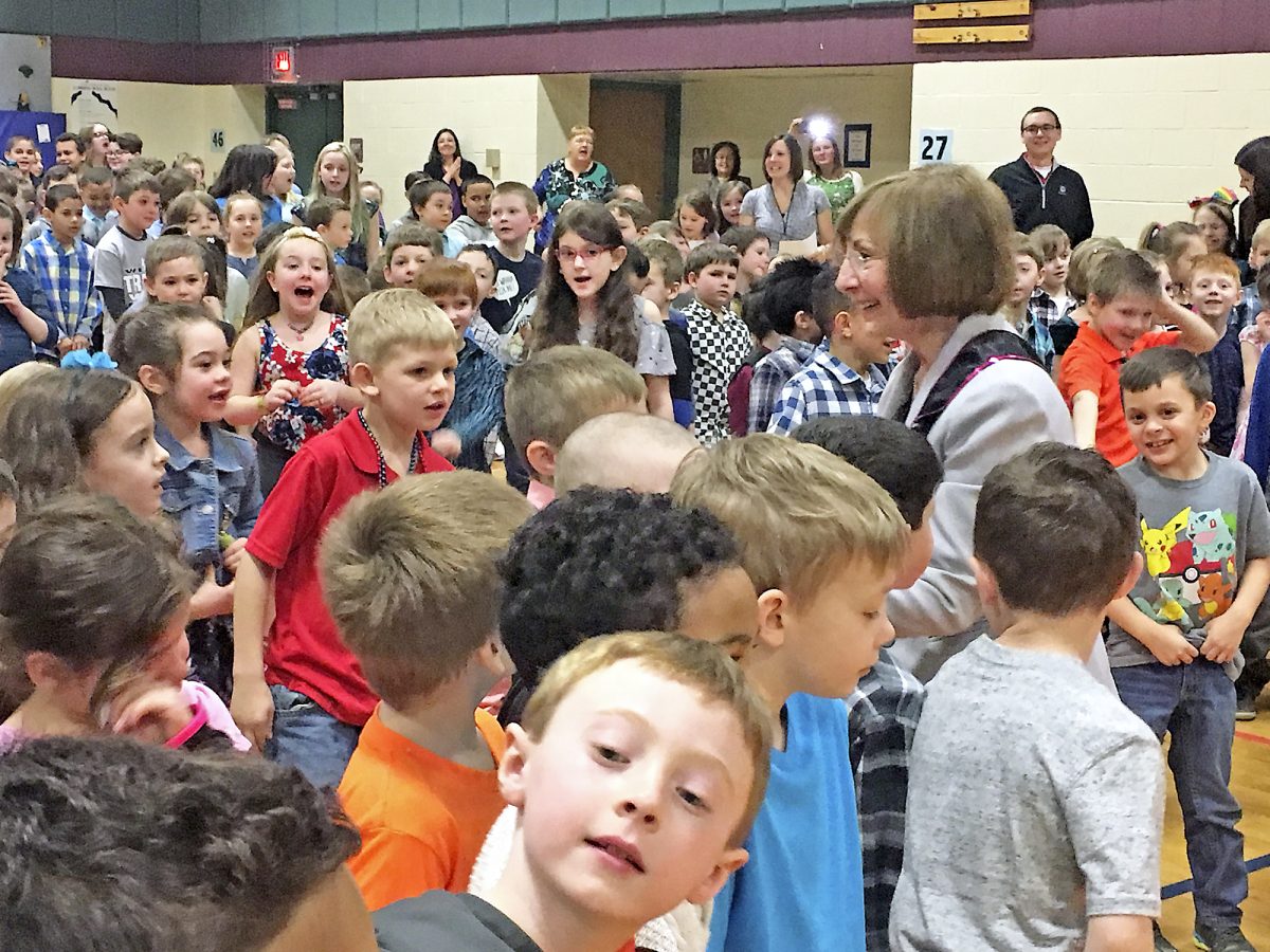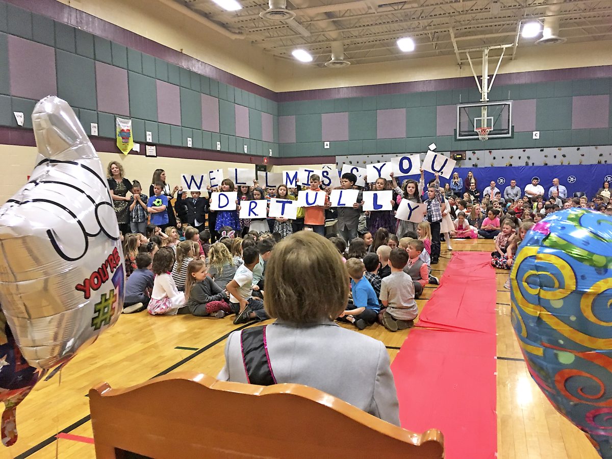 Staff and students organized an all-school assembly for Tully, who is retiring as principal after 10 years. Students presented her with flowers, a sash and tiara, and led her around the room before escorting her to a throne. Every grade, from pre-k through fifth, took turns singing a tune they had prepared.