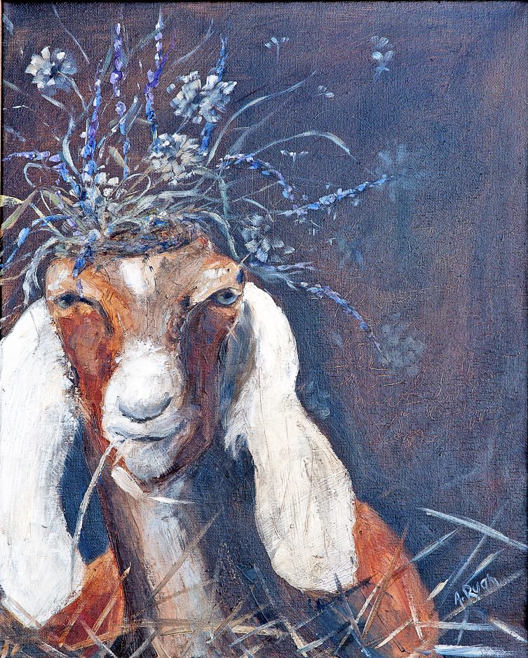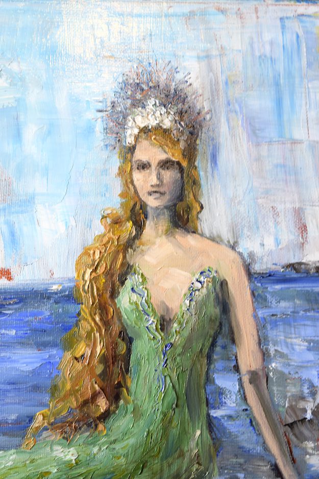 What are you currently working on? I am currently working on a few projects. I am working on a farmers market series that includes still life of fresh fruits and vegetables along with farm animals. My inspiration for the farm animals are mainly drawn from local farms. I also meet with an independent artist group in Wheeling, W.Va., where we hire models to sketch. These drawings are many times the basis for my storybook characters of mermaids and fairies. My newest passion is representational abstract expressionism. I really enjoy the freedom and intuitive nature of this style. I am experimenting with cold wax, joint compound and thick impasto. These paintings tend to have an underlying meaning that has a more spiritual element in an effort to make the invisible, visible. I also have three commissions right now – a seascape, a wedding gown portrait and a still life.