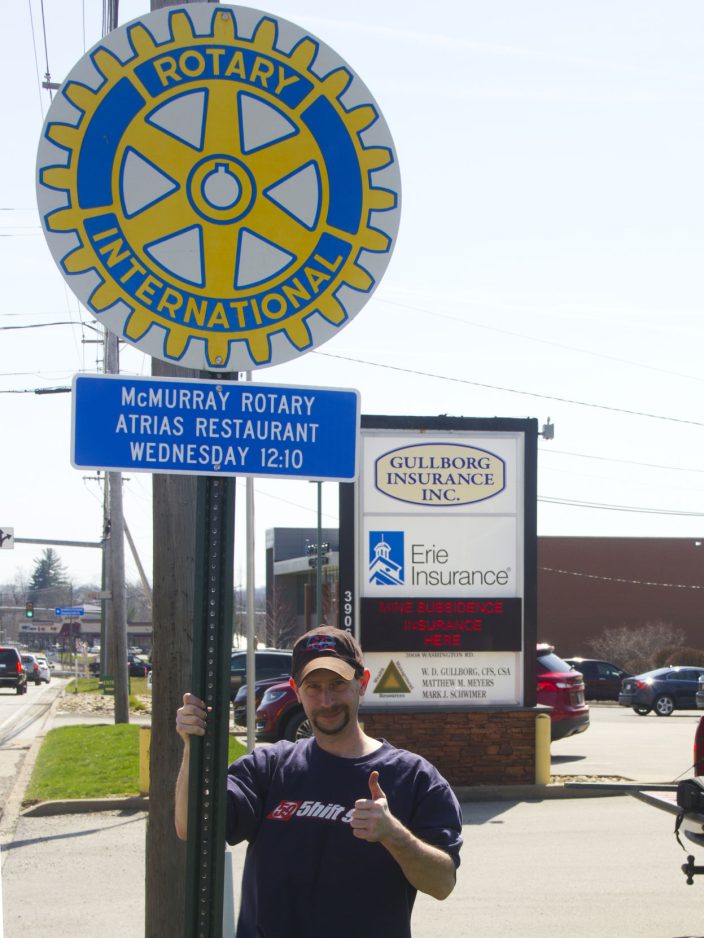 Installing a new McMurray Rotary Club sign along Route 19 is Bob Corson of Corson Custom Graphics in Canonsburg.