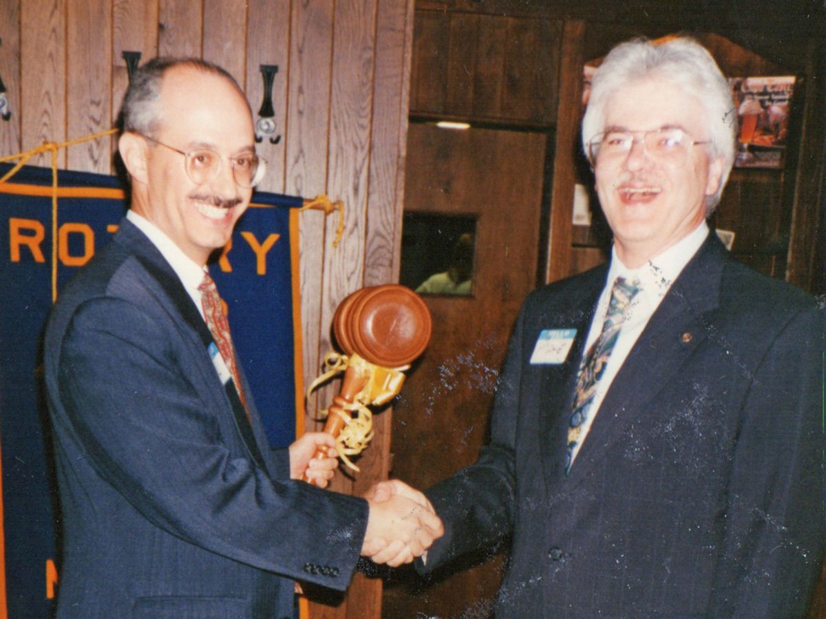 Michael Silvestri, right, passes the gavel to Albert DeLucia as he takes over as McMurray Rotary Club president for 1996-97.