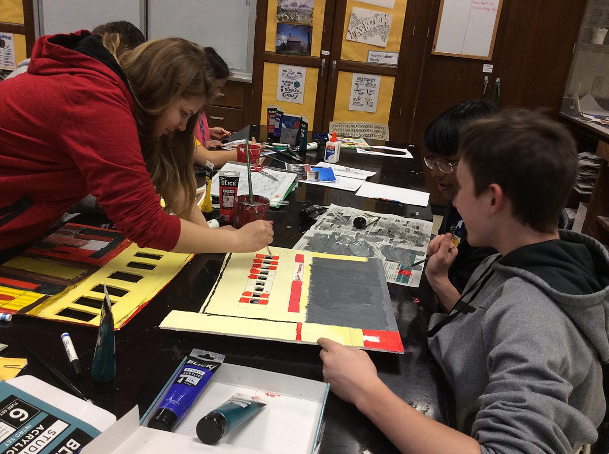 While students tried to paint realistic buildings, they used more expression in the backgrounds.