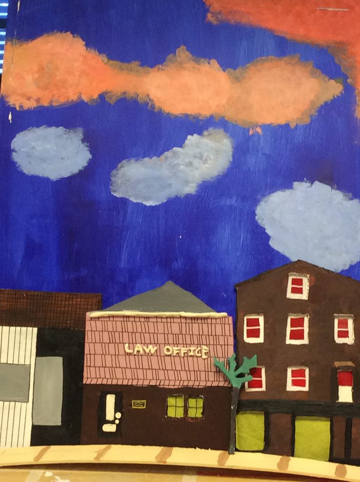 Students kept the characteristics of the buildings, but took artistic license with the background and sky.
