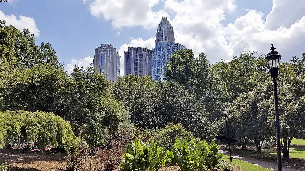 The Charlotte skyline behind one of the city’s parks and green spaces.