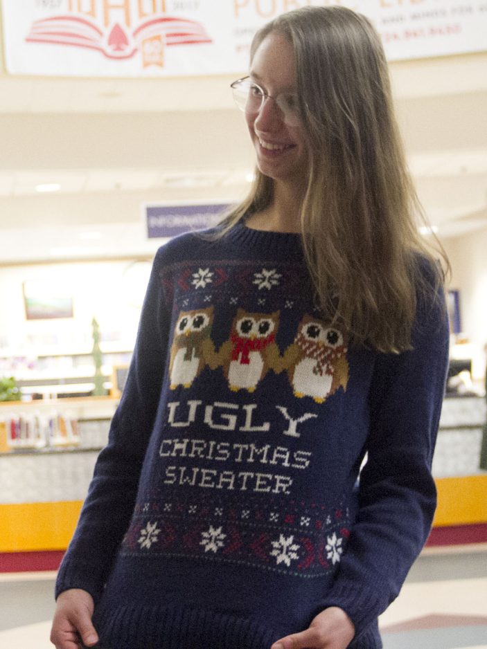 Alex Owsiany shows off her “ugly Christmas sweater” prior to the start of festivities.