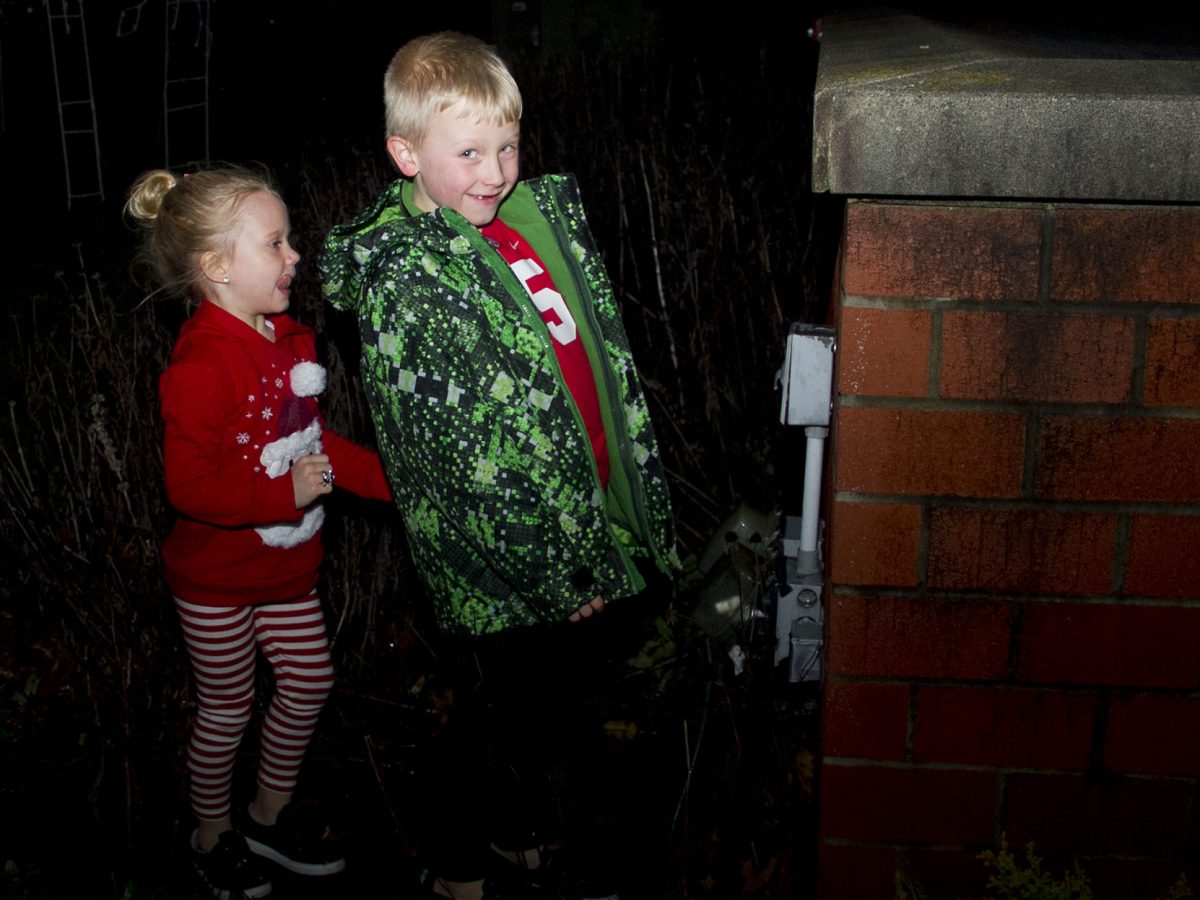 Well, someone did have to be in the rain to flick the switch to light the tree and other decorations outside of Peters Township Public Library. That honor went to young Lester and Samantha Botkin, who braved the elements to brighten the night.