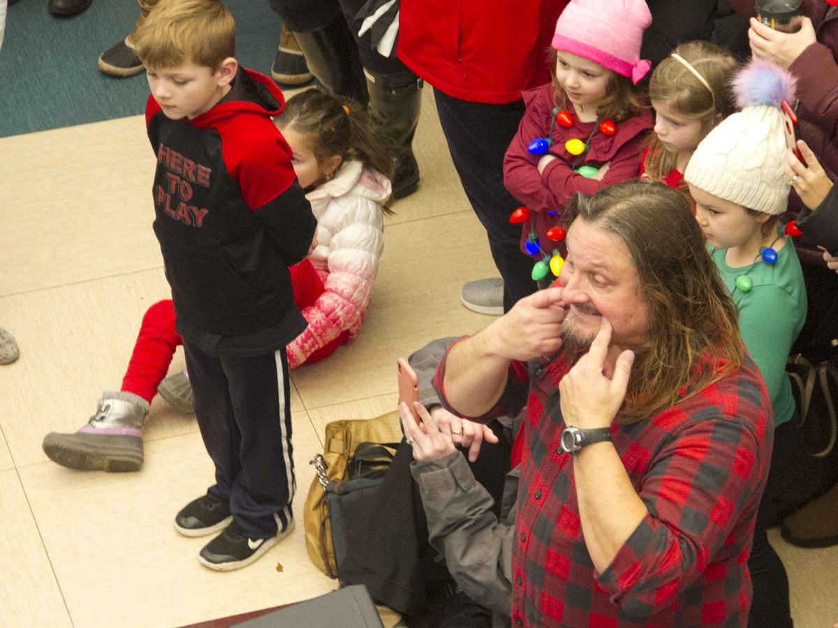 The usual format for the annual event a musical performance in front of the library entrance, followed by activities inside, featuring a visit by Santa Claus.