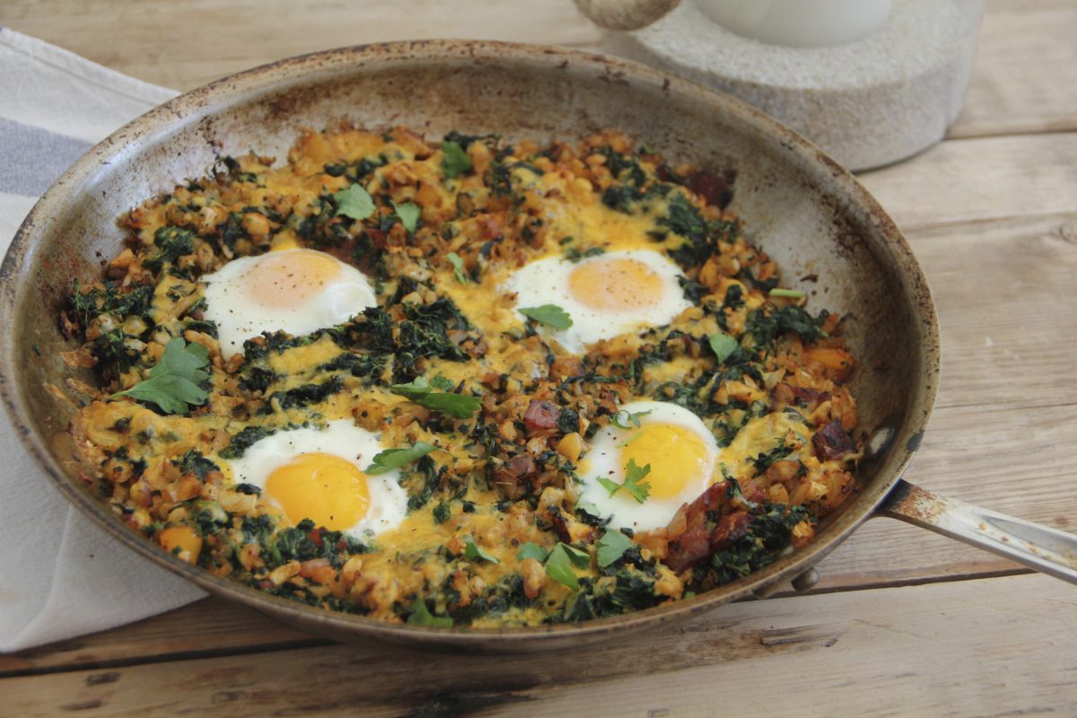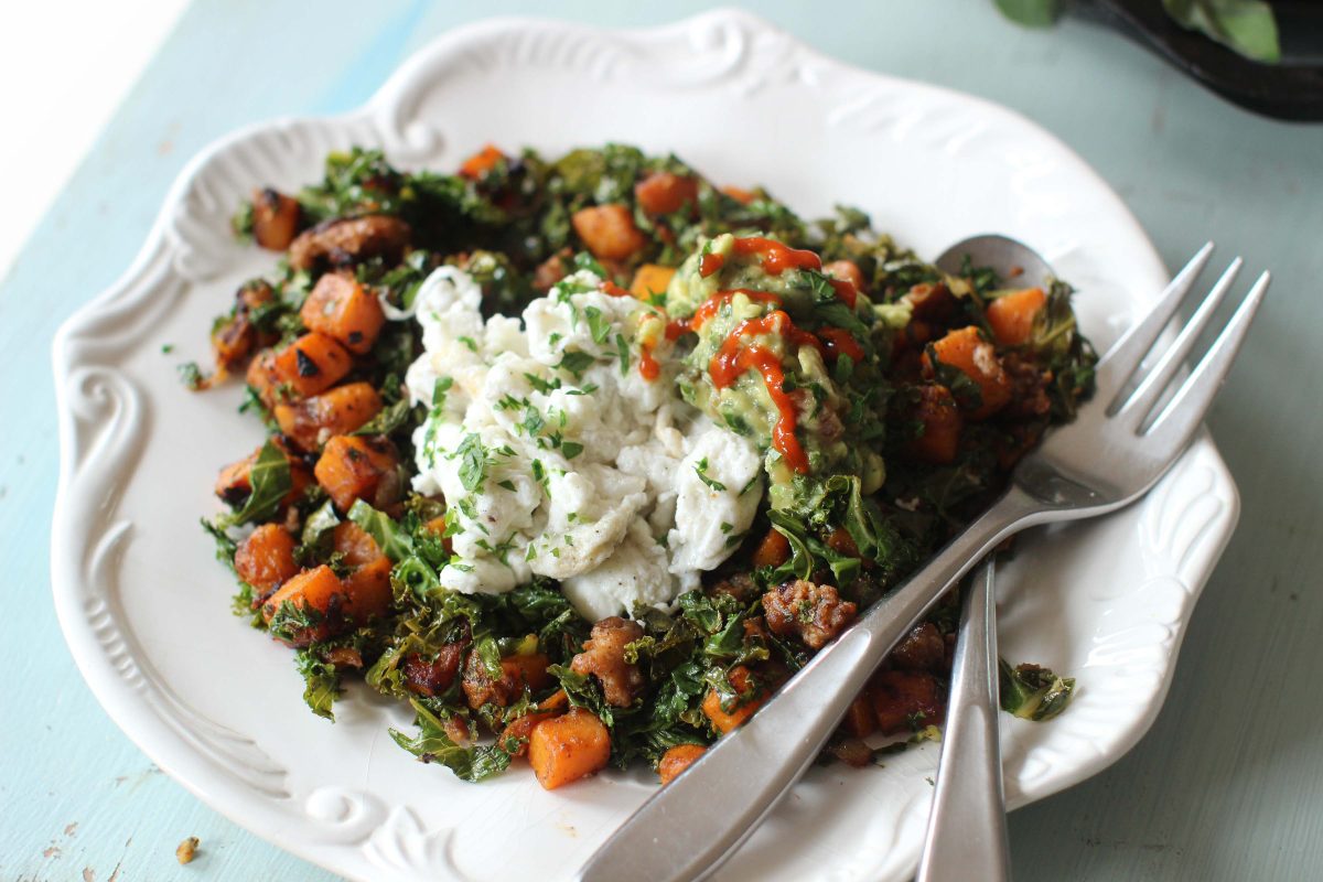 Some healthy breakfast examples that include all four groups – carb, protein, fat, produce – include oats, Greek yogurt, almonds and berries. Or try a scramble with eggs, sweet potato, olive oil and vegetables like mushrooms, peppers and onions. A third option would be a whole wheat tortilla with chicken, avocado and salsa. When in a rush in the morning, try hard-boiled eggs with a whole grain English muffin or fruit with yogurt, peanut butter or almond butter.
