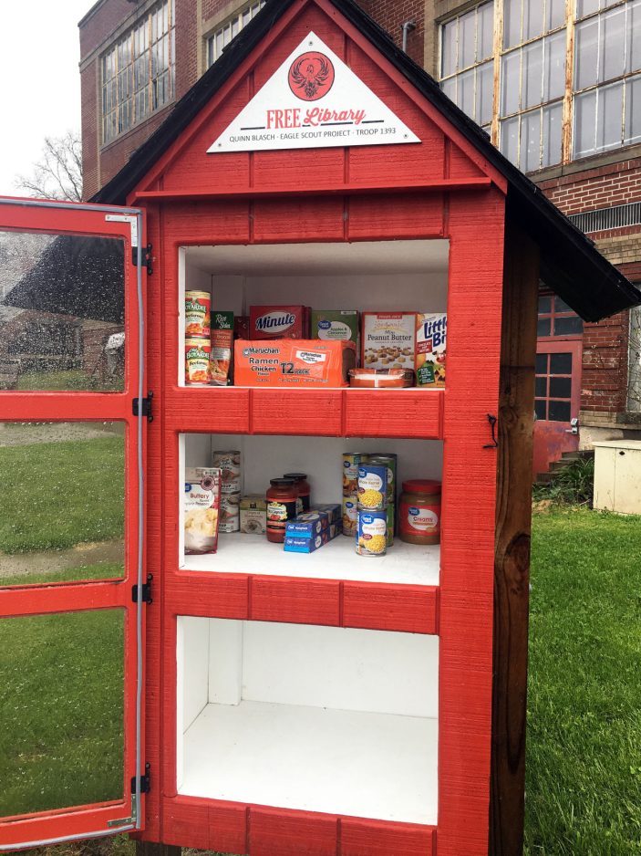 Led by Bunta’s former classmate Kandi Woods, the organization’s volunteers are stocking a series of “li’l food pantries,” including one at the Venetia Heritage Society building, the old Venetia School in Peters Township. According to the It Takes a Village Facebook page, “If you are in need, please help yourself. If you have a little extra, please consider donating.”