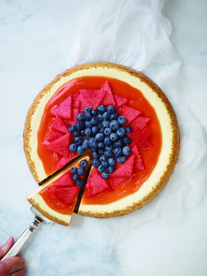 To serve, run knife around sides of cheesecake and remove springform pan sides. Top each slice with generous helping of watermelon-blueberry sauce.