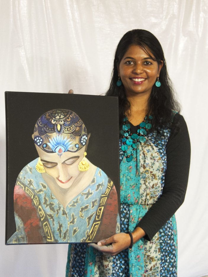 She also is presenting one of her own paintings, which she calls “The Henna Crown,” depicting a woman with tattoos covering her bowed head as a symbol of the hair loss that many cancer patients must face.