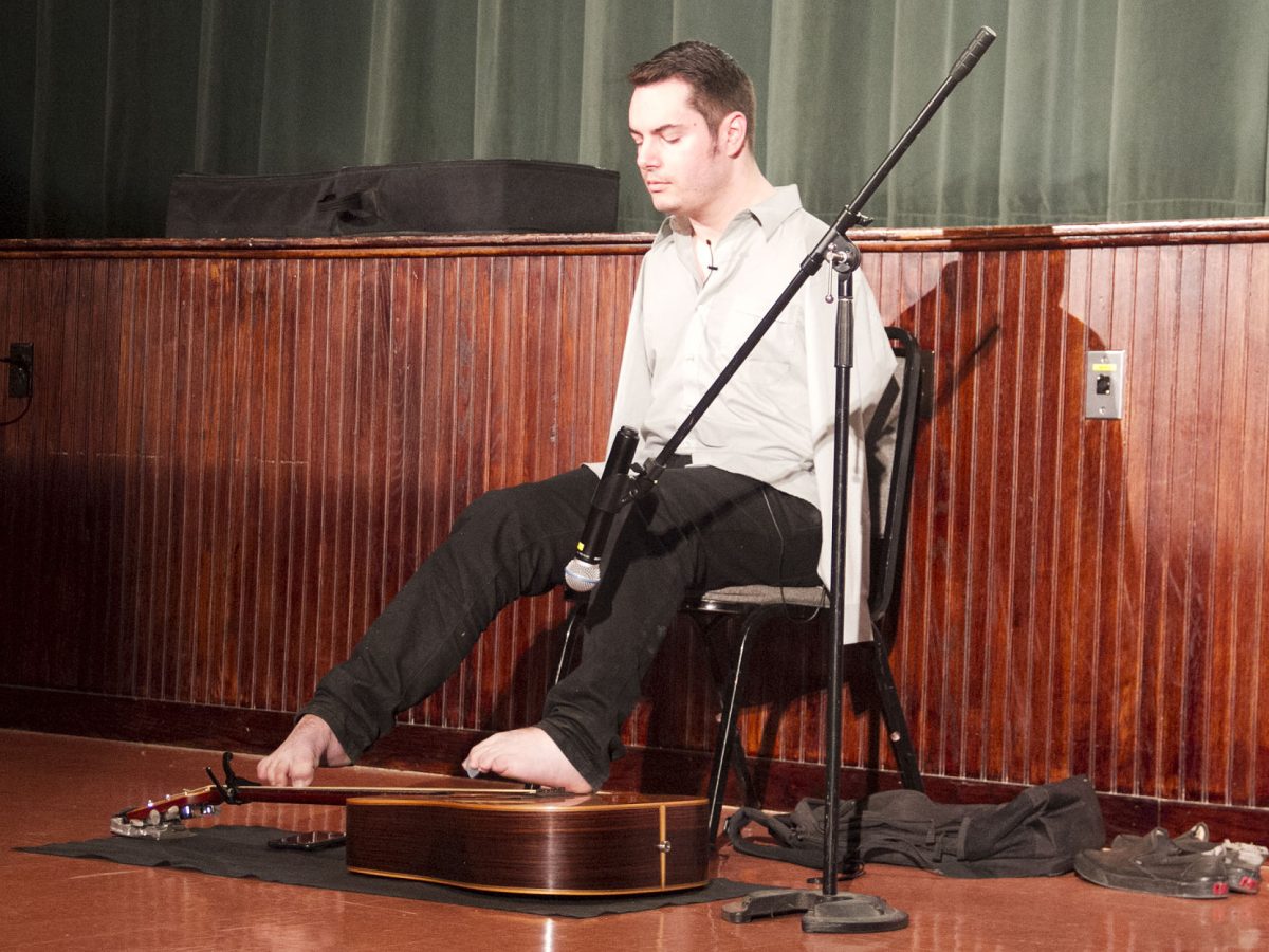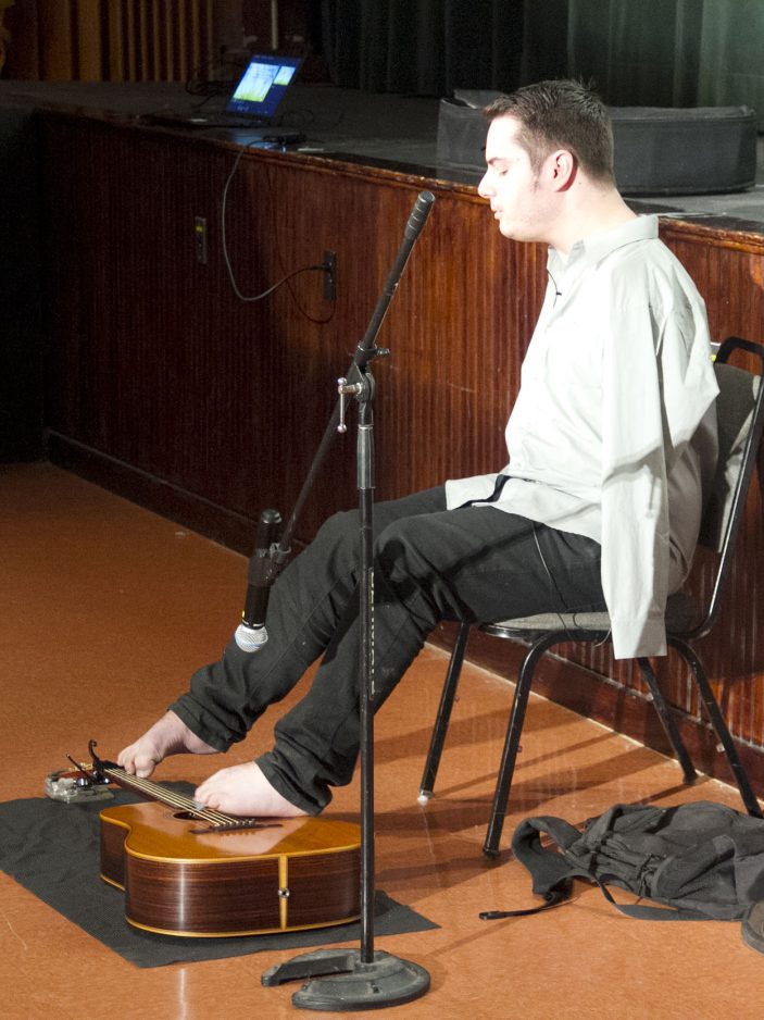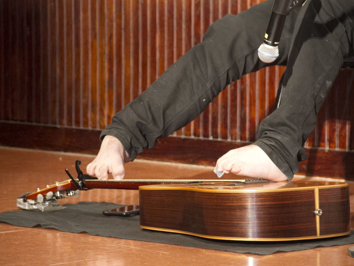 With two toes gripping a pick, he uses his left foot to strum and his right to form chords, in standard tuning, no less. And his impeccable playing, often accompanying his singing, has been known to prompt veteran guitarists to tell him: